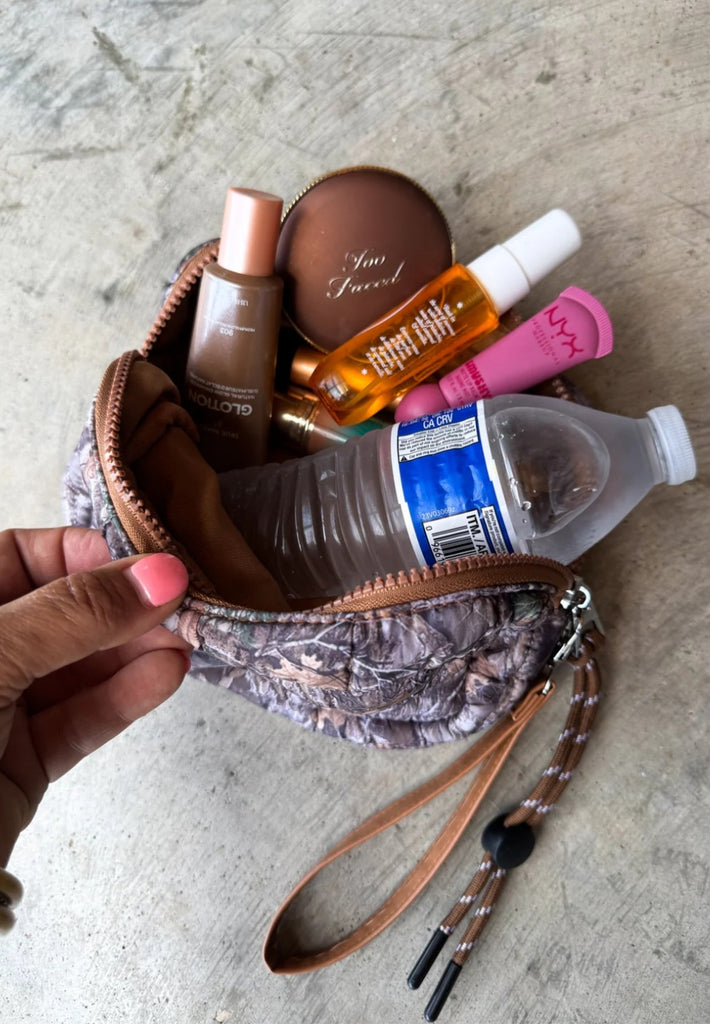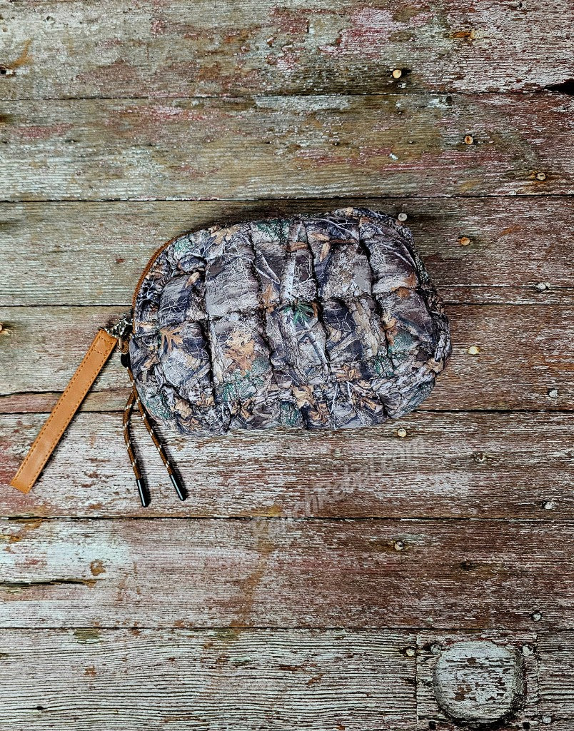 The perfect place for keys, phone, wallet, money, cards & daily essentials. This puffer mini has a rustic camo print in a quilted puffer style bag with a zip top & removable clutch strap. It has a solid brown interior with one open compartment. The fabric on both the outside & inside is a wipeable nylon.