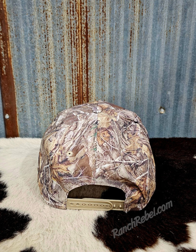 A rustic camo print with YEEHAW embroidered in soft pink. It has an adjustable, snap back closure.
