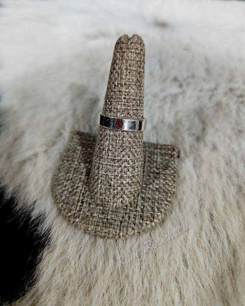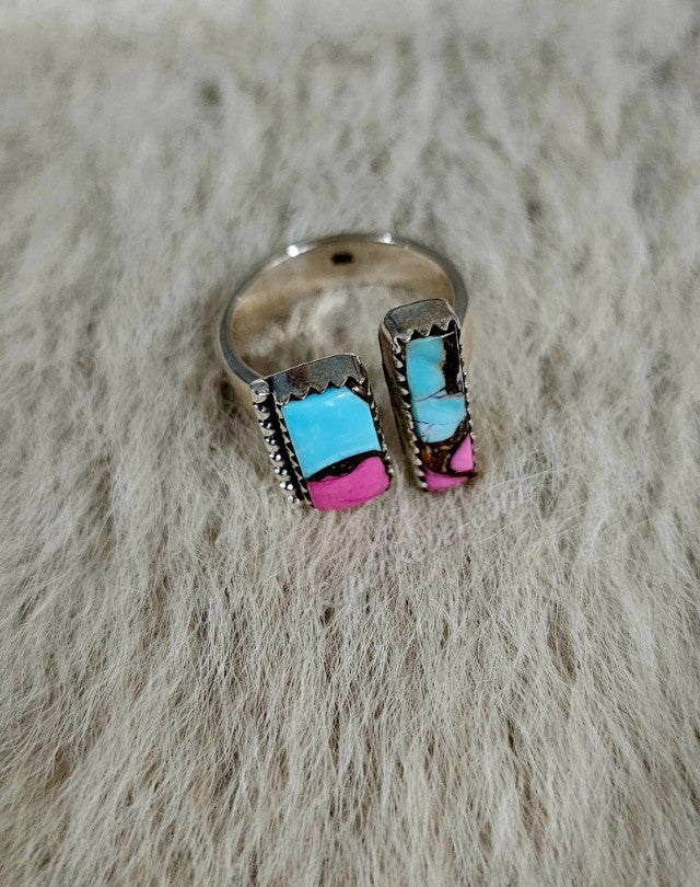 Two sizes of rectangle shaped cotton candy stones with a mix of bright pink, turquoise & bronze are set in sterling silver. Tiny silver dots outline one side of one stone. The band is narrow, smooth silver & it is adjustable.