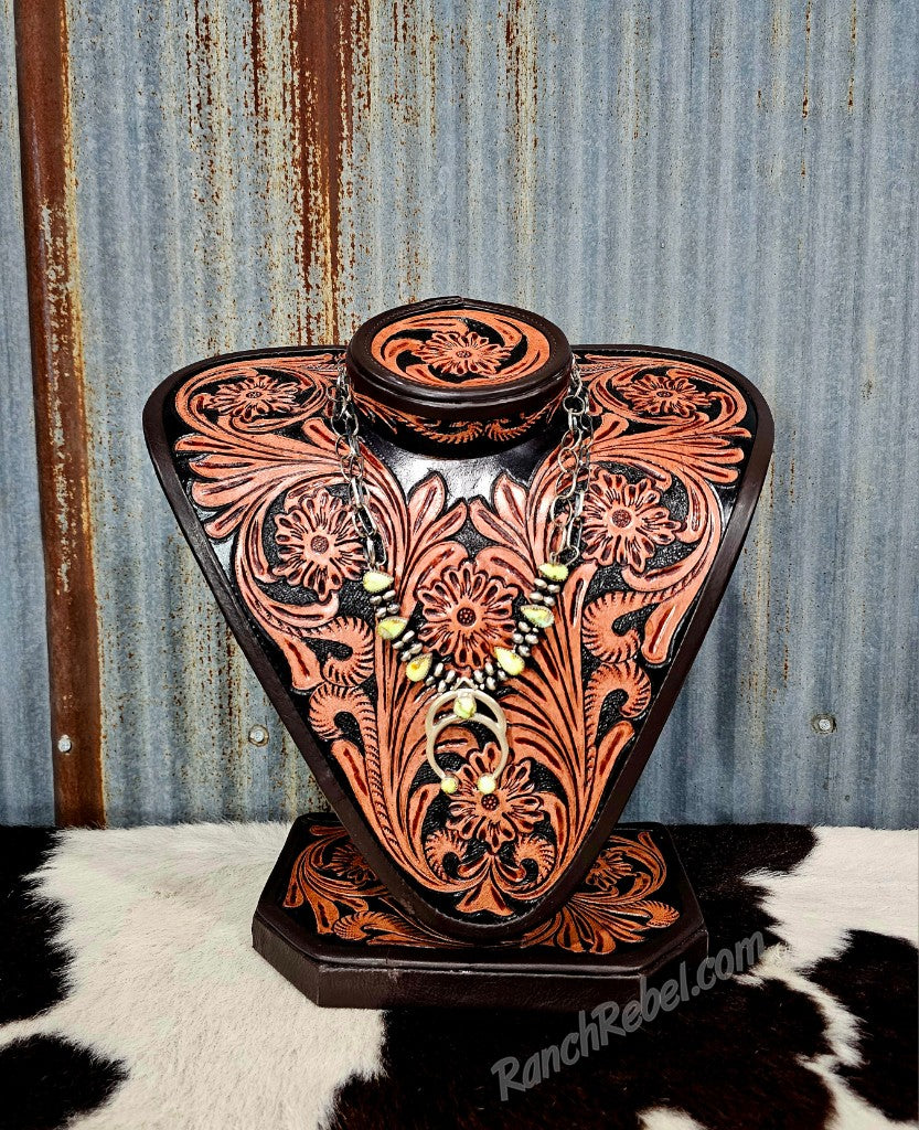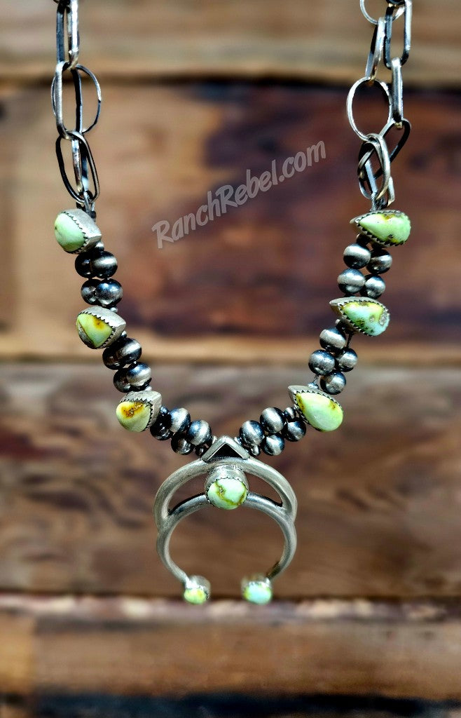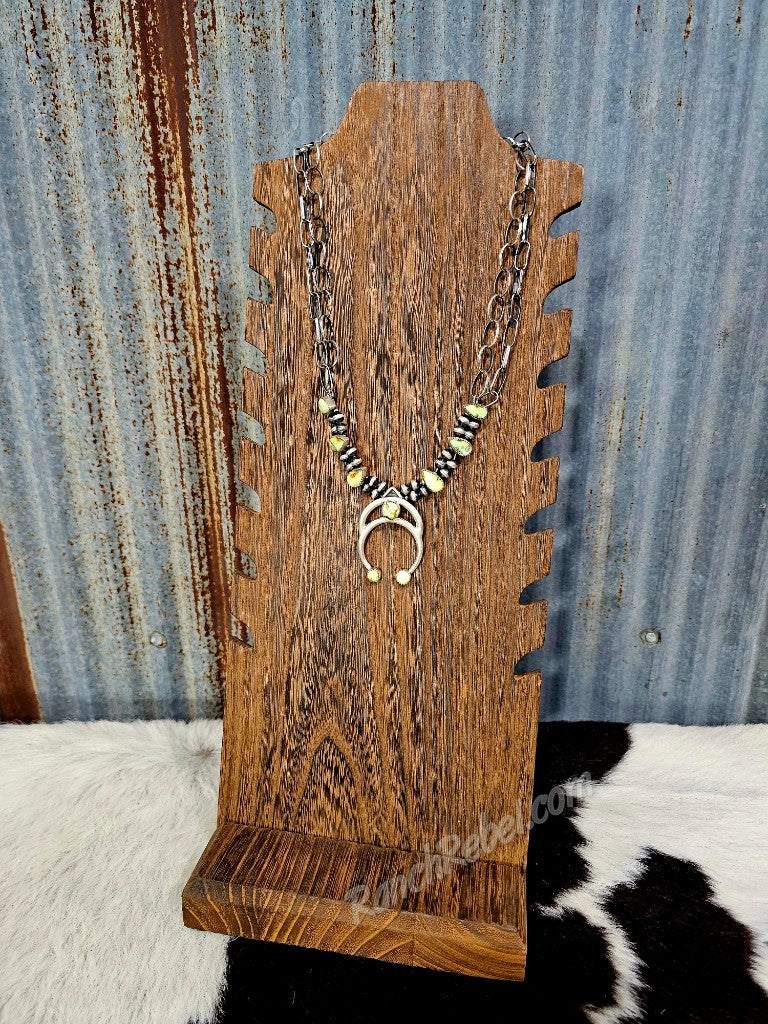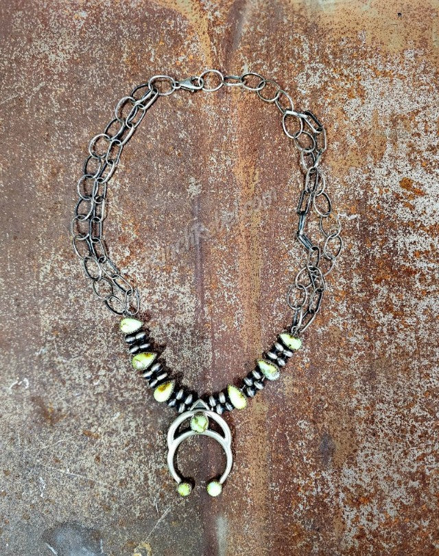 If you have an eye for something different, here it is. This squash combines modern & traditional elements for a look like no other. The double squash is the main focal point with two rows of sterling pearls & teardrop shaped palomino stones. The top of the necklace has double rows of different shaped chains.
