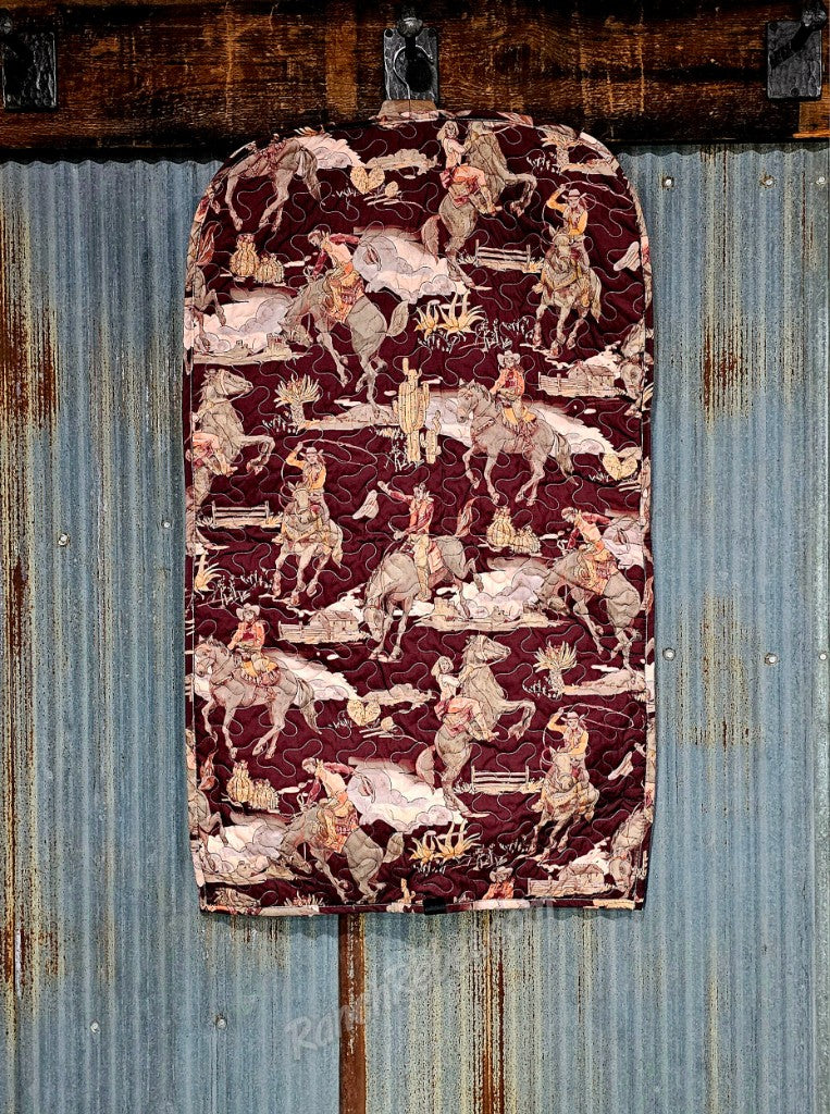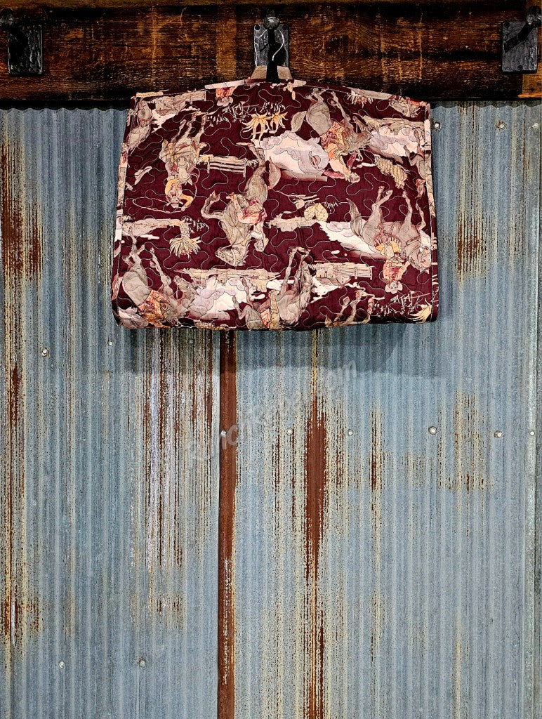 A quilted fabric garment bag in a maroon color with a retro cowboy & cowgirl print. It has a full zip front with a cut out top for hangers & a nylon loop at the bottom for folding in half & looping through the hanger tops. The interior fabric is a cream floral pattern.