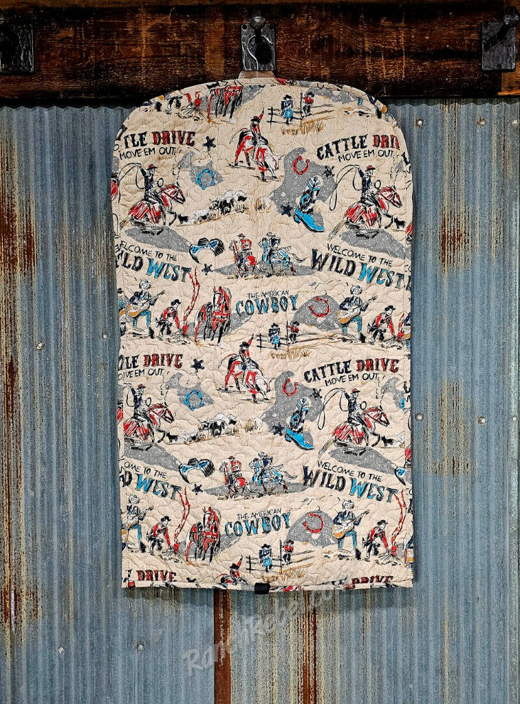 A quilted fabric garment bag in a linen color with a retro cowboy & cattle drive pattern. It has a full zip front with a cut out top for hangers & a nylon loop at the bottom for folding in half & looping through the hanger tops. The interior fabric is a cream & denim stripe pattern.