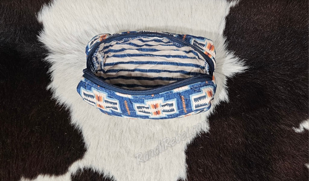 A cute little quilted bag for cords, brushes or a small amount of makeup or jewelry. This unstructured bag has a zip top, one open compartment, & would be great for your purse as well as travel. It has a denim blue colored background with a southwest design in natural, rust & blues. The interior fabric is denim blue & natural stripe.
