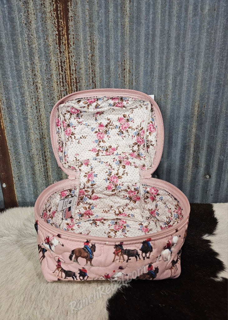 A handy little bag perfect for makeup, jewelry & accessories. This unstructured bag has a carry handle, two way zipper & a contrast interior fabric with one open compartment. This one features a light rose colored background with bullriders & ropers in dark pink, white, brown & navy.