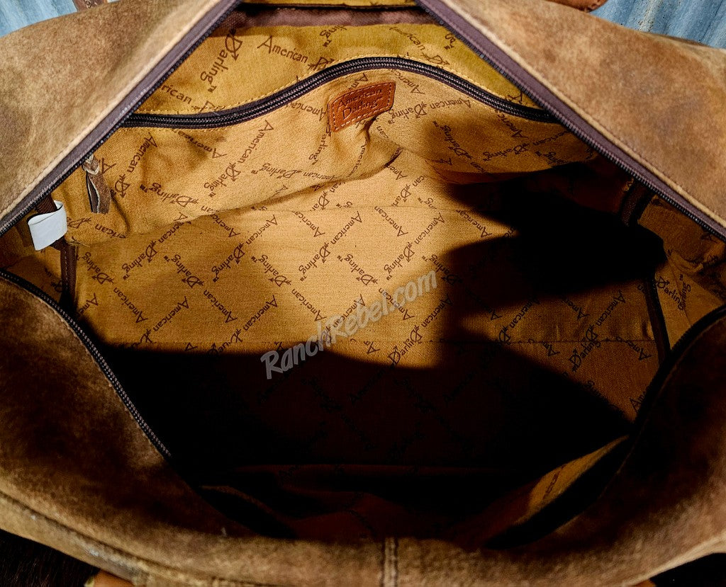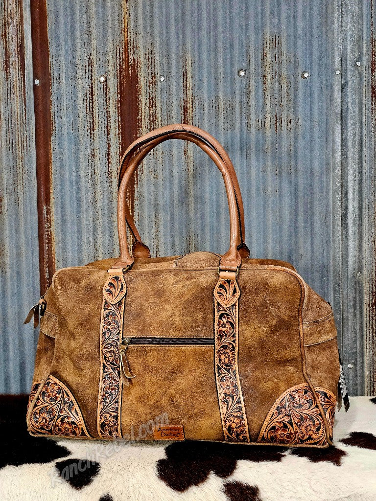 A rustic suede leather bag with tooled leather accented panels on the front & back & at the bottom corners of the bag. It has a metal footed bottom, dual, rolled leather handles, a small snap pocket & small zip pocket on the outside. It has a double zip top entry & inside is a large, open compartment with a larger side zip pocket & large side slip pocket. It comes with a removable, adjustable leather & nylon shoulder strap. A great size for the weekend or as a carry on.