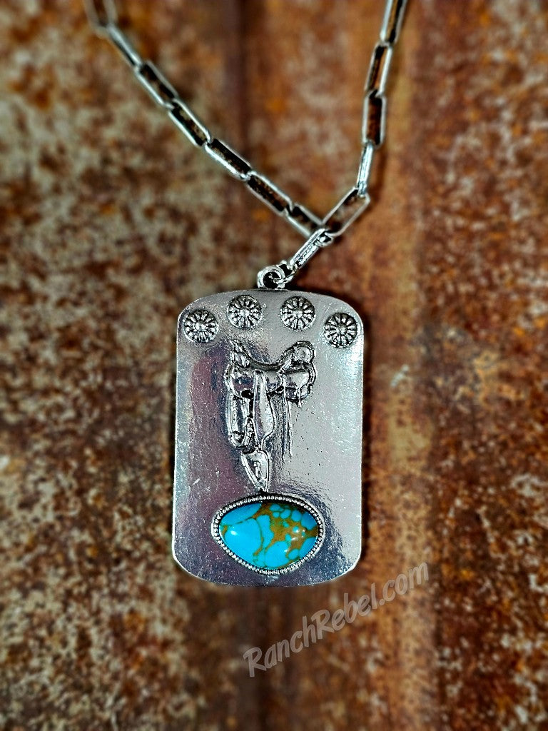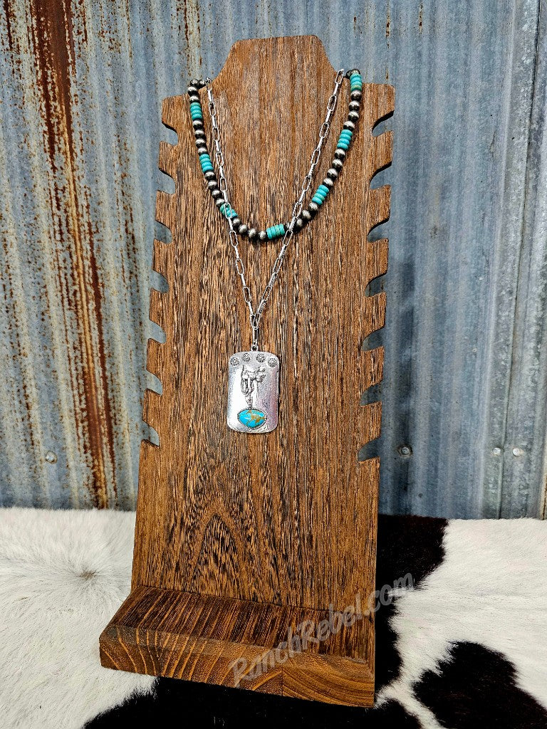 Layering made easy with these two necklaces. A silver plated large chain link necklace with an attached pendant featuring a faux turquoise stone & Vintage Saddle. The other necklace features faux silver pearls & turquoise. Both have lobster clasps with 3" extenders.