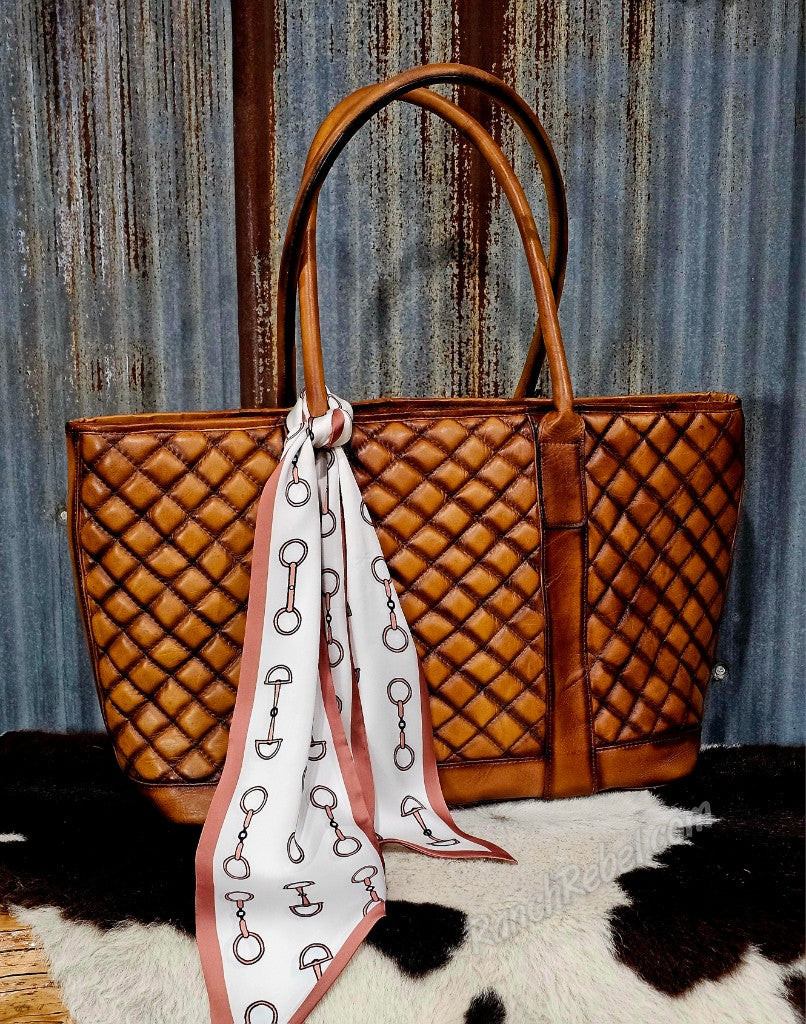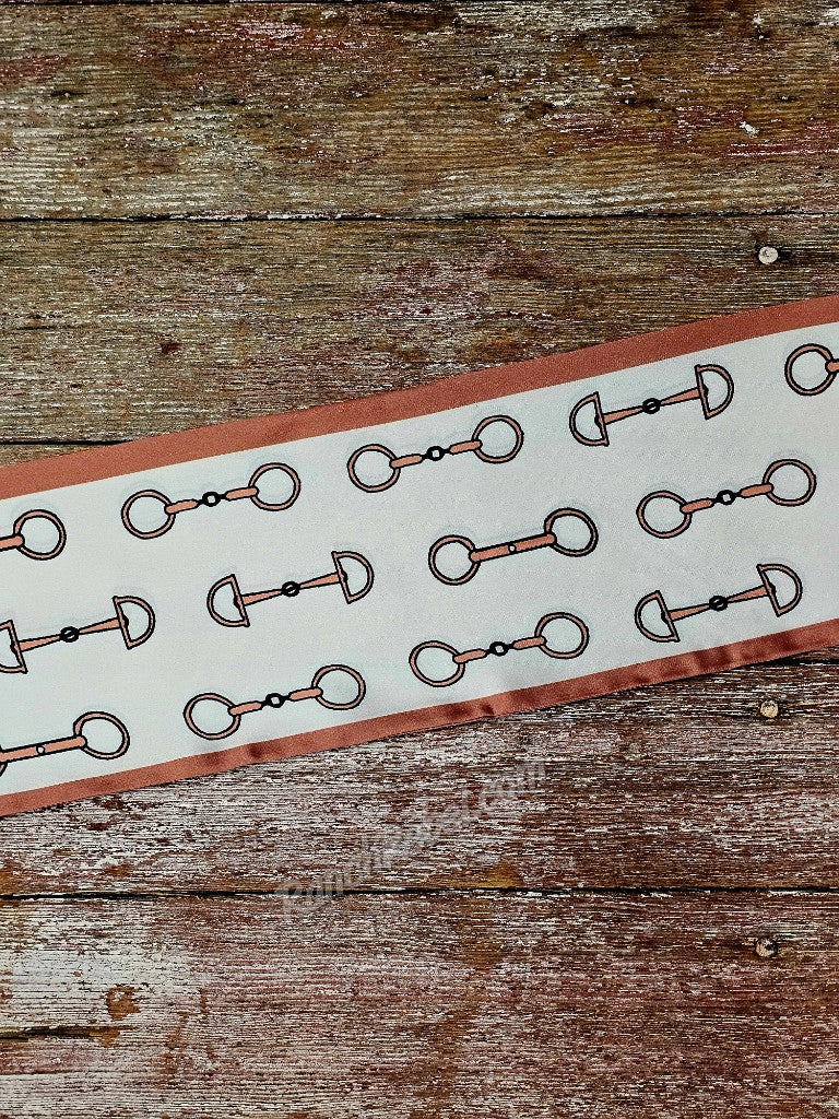 A cream colored twilly with a mocha colored border & snaffle bit design on both sides.