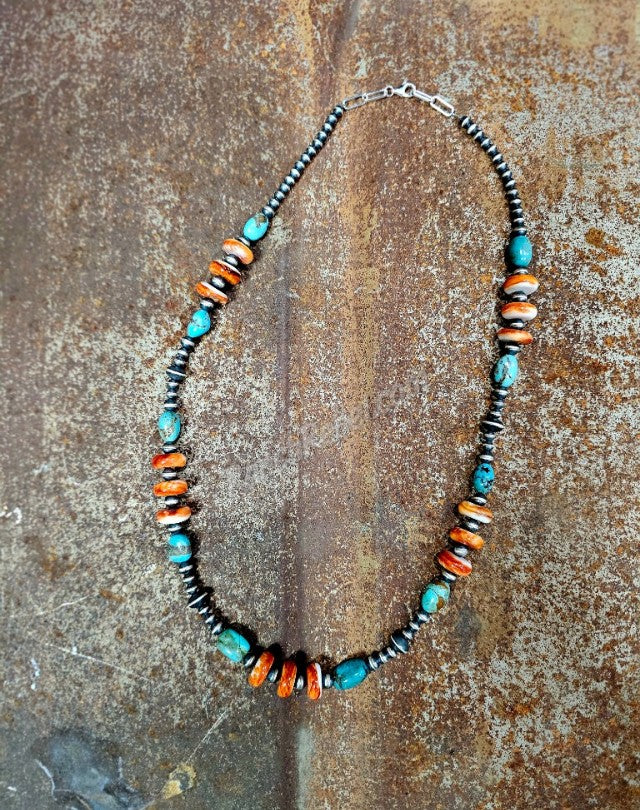 A 22" necklace with sterling silver pearls, sterling silver saucer pearls, thick orange spiny discs & turquoise nuggets. Very pretty with lots of great color!