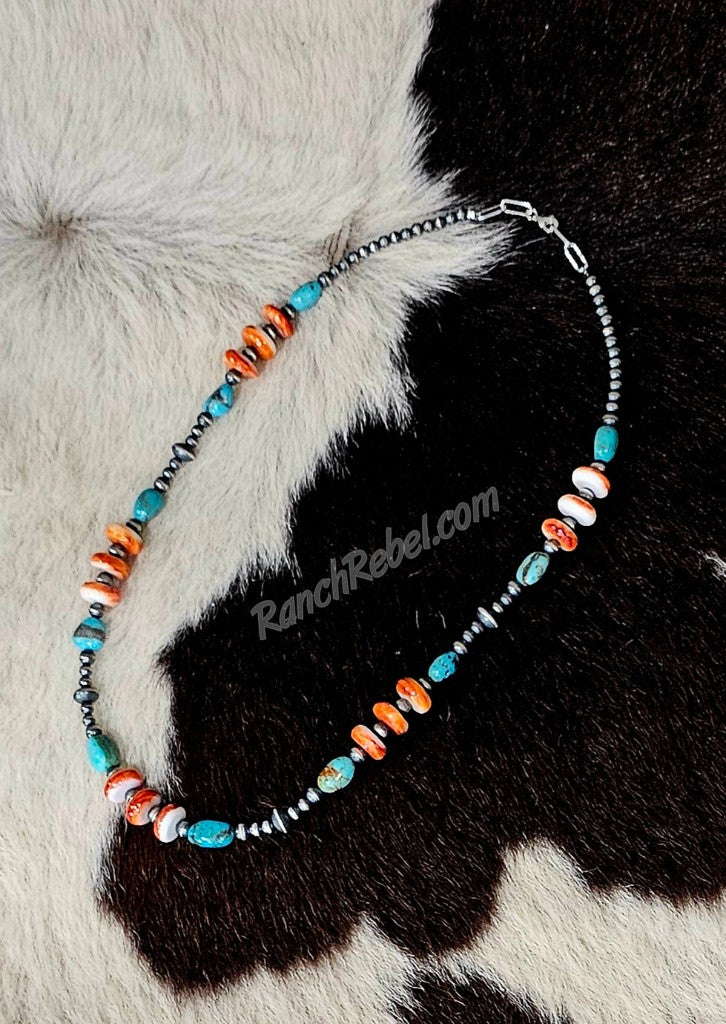 Sterling Pearl, Orange Spiny & Turquoise Necklace #6323