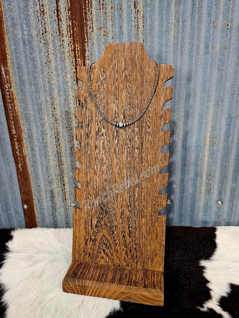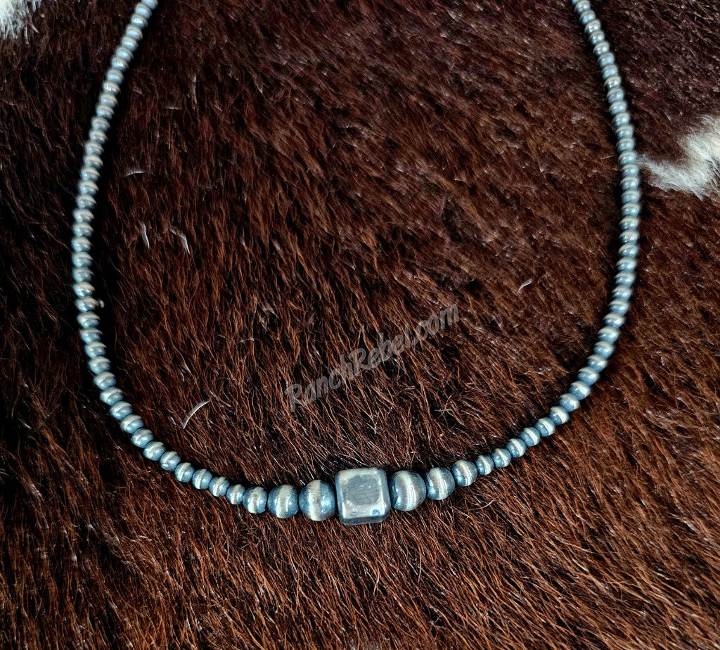 A 16" necklace made of 3mm sterling silver beads that gradually get larger at the center with a square sterling silver bead in the middle.