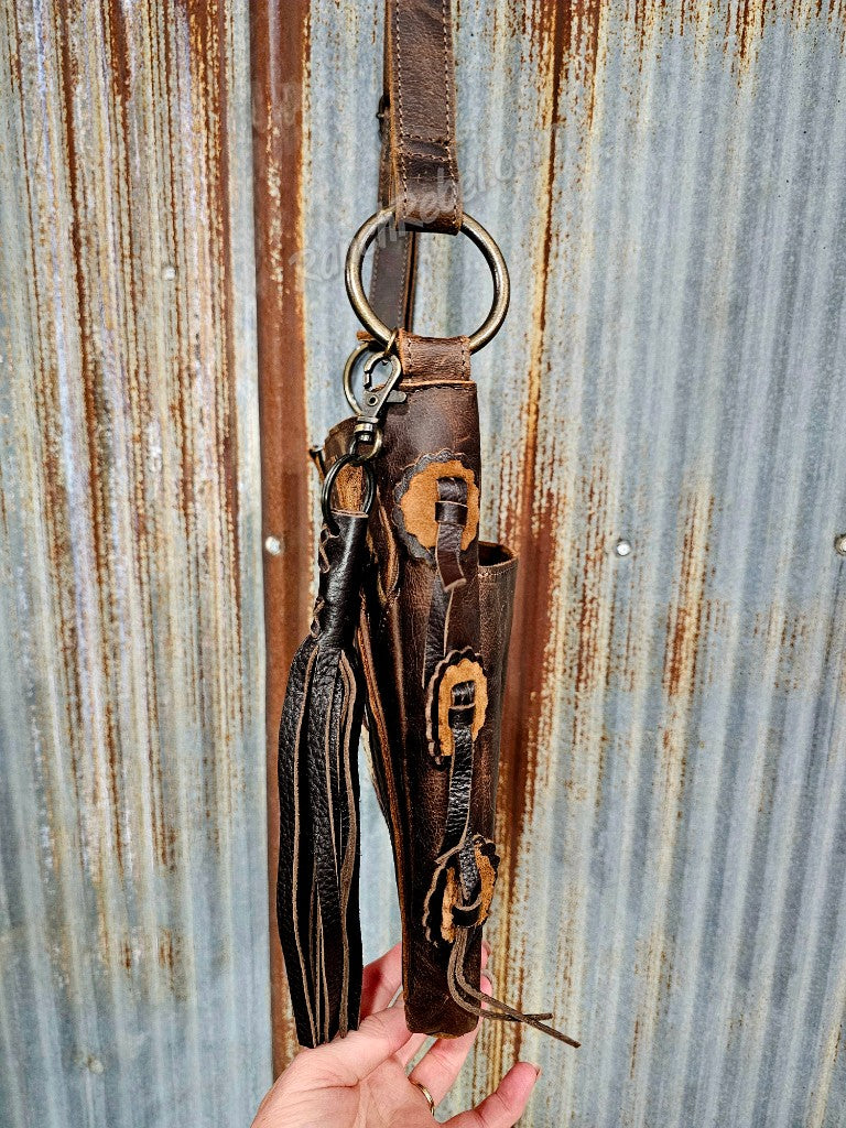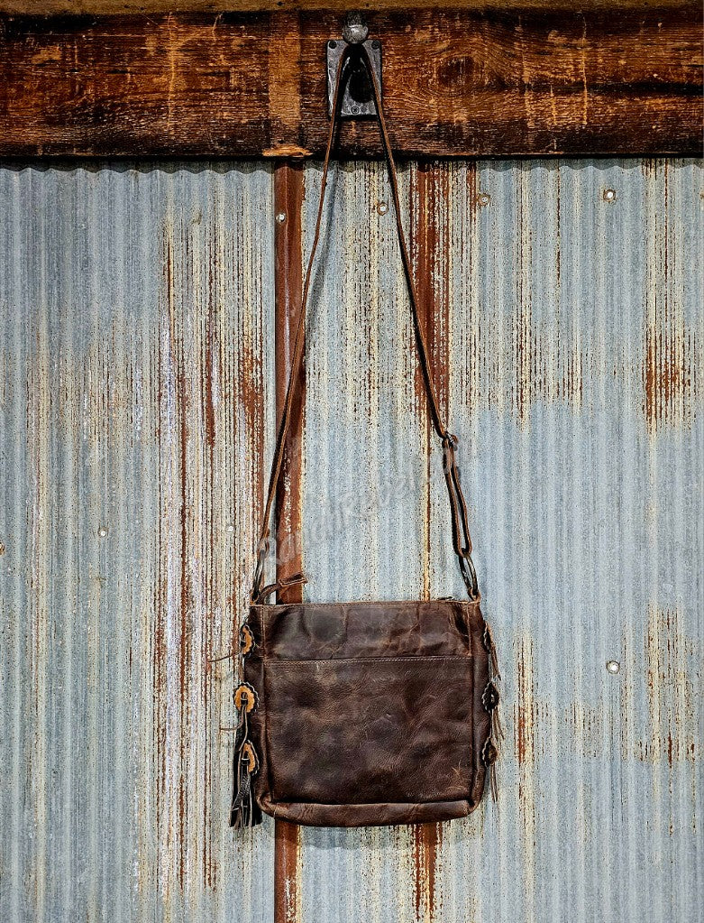 Dark brown, rustic leather combined with heavy serape fabric in southwestern earth tones of cream, chocolate, black, rust & denim blue. The Olivia Crossbody bag has a handy, built in wallet in the front panel. It has a photo ID slot, zip pocket, 9 card slots & an open compartment. It shuts with three heavy duty magnets. The back is smooth leather with a roomy slip pocket. It has a zip top & inside is a conceal carry holder, a large slip pocket, & a zip pocket. "When faith is present, miracles happen" is printed inside. It has a long leather strap that is adjustable with a slide buckle. The bag sides have decorative leather rosettes & there is a removable, decorative leather tassel.