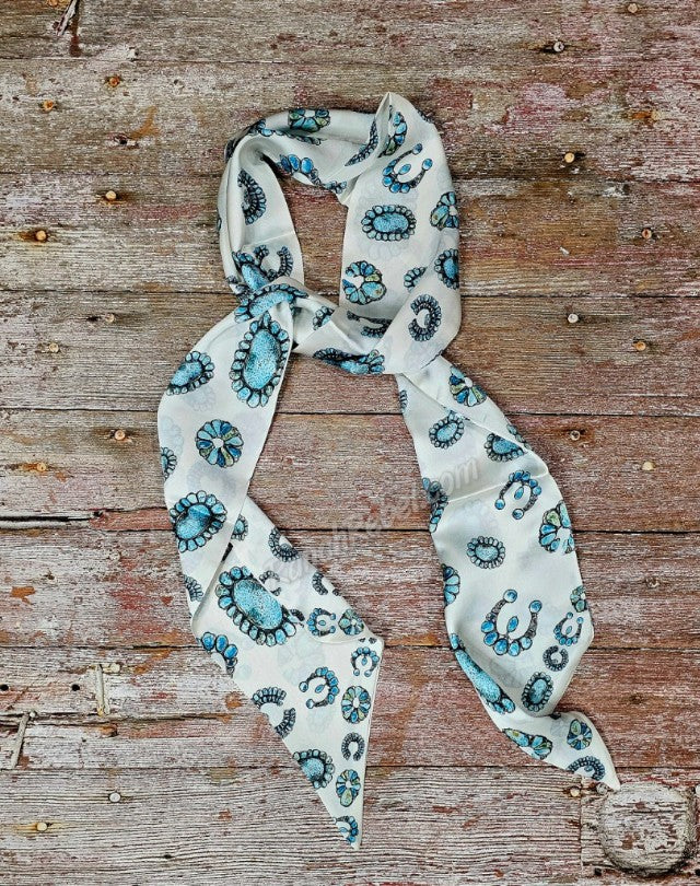 Clusters of turquoise jewels on a cream colored background.  So many ways to wear it.  Around your neck, in your hair, on a purse strap, or around your waist.