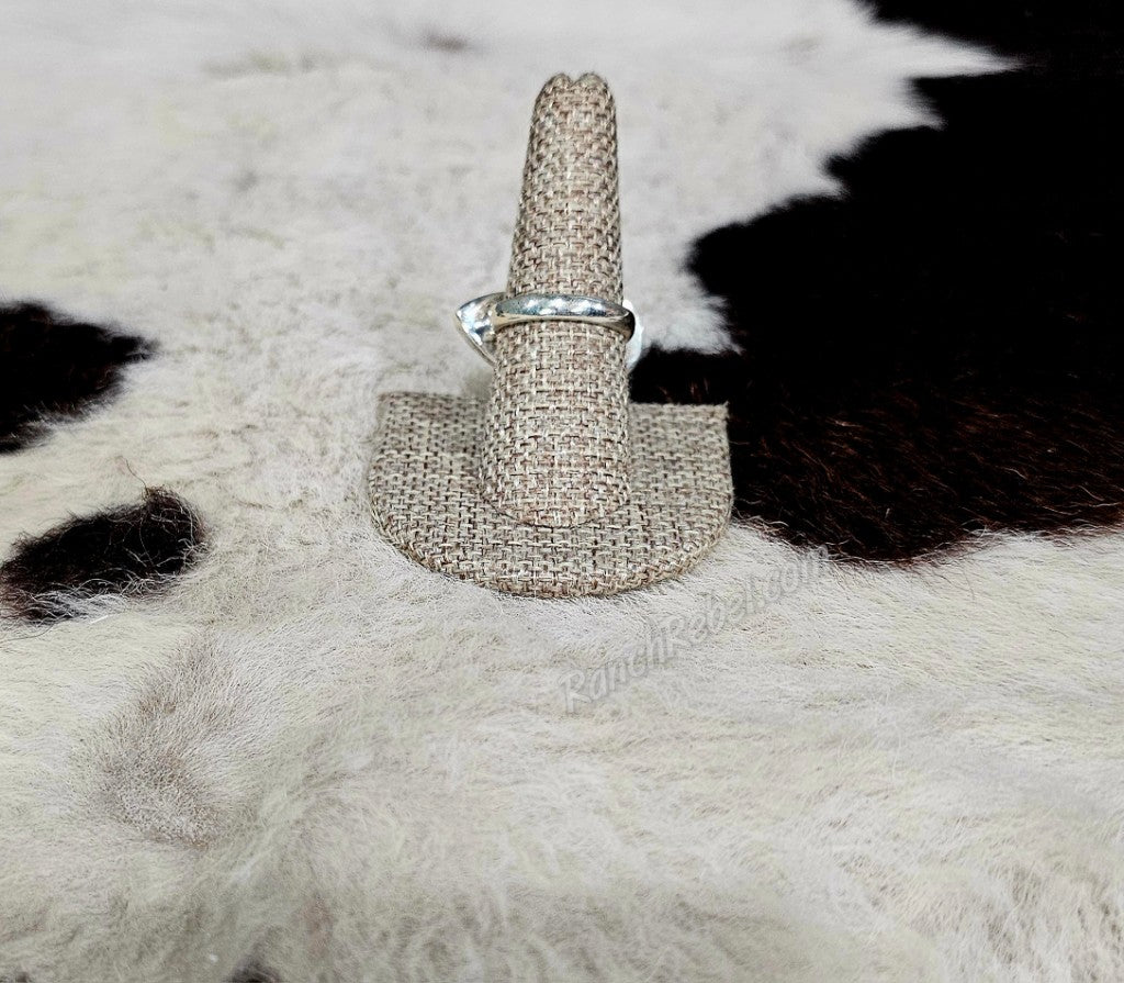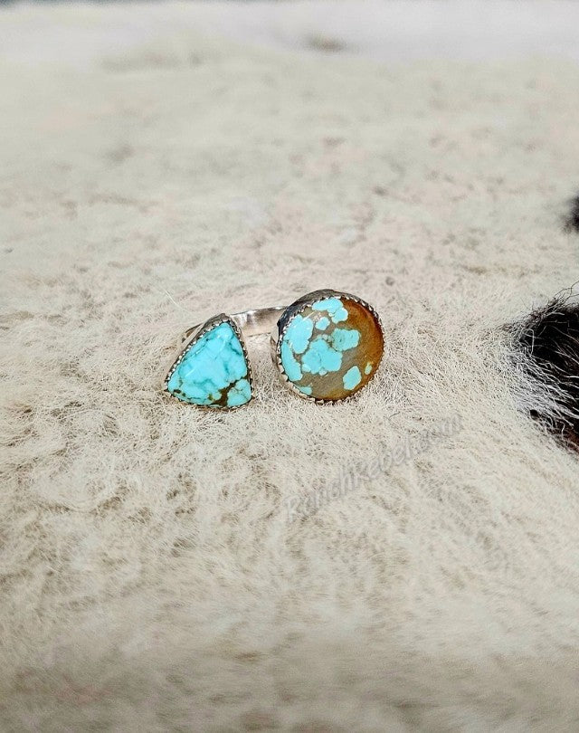 A two stone turquoise ring with a round stone & triangle shaped stone set in a sterling silver adjustable rounded band.