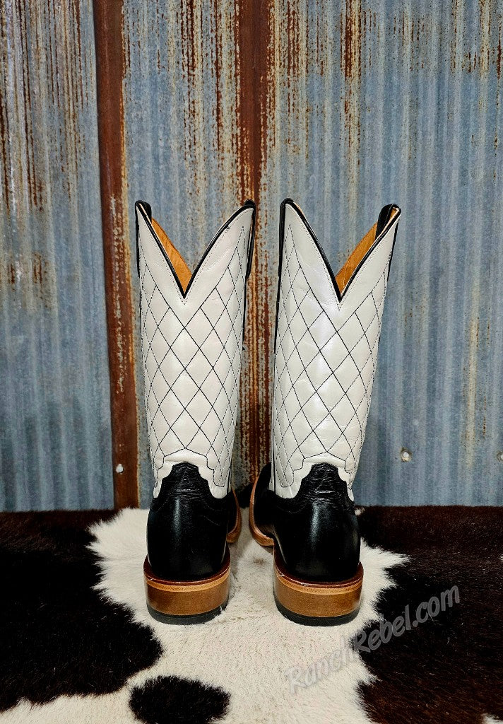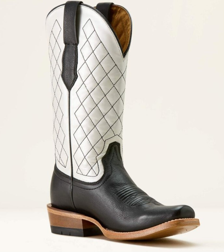 Just like the little black dress, these boots are wardrobe staples. They have a narrow cutter toe & are a performance boot that radiates western elegance. The foot is soft, black leather with black bootstitching. The shaft is pearl colored, irridescent, with black quilted stitching. The soles are water resistant leather & the insoles have heel to toe cushioning for all day comfort.