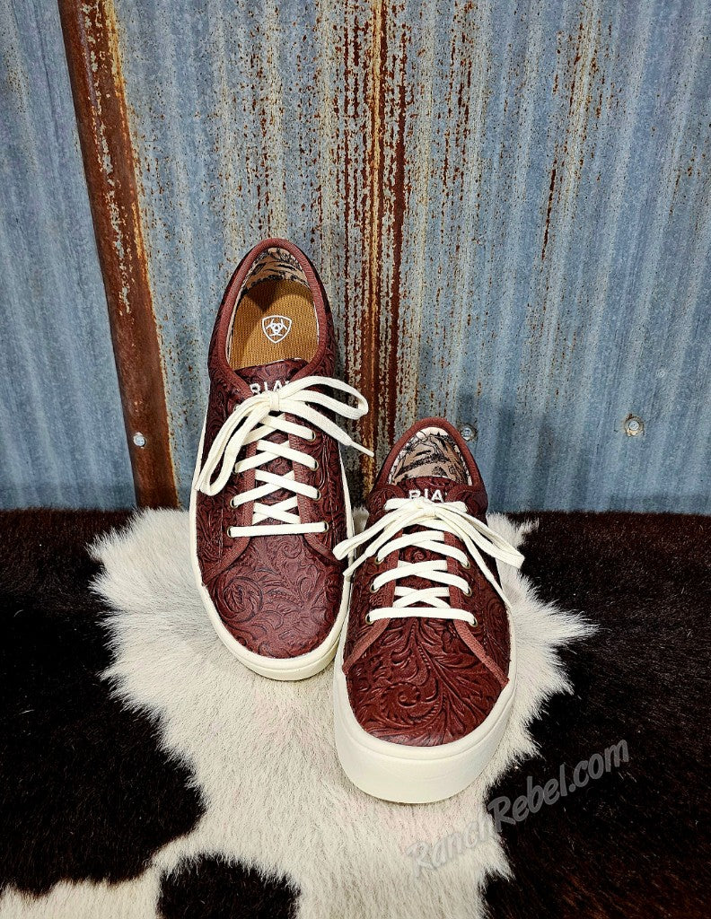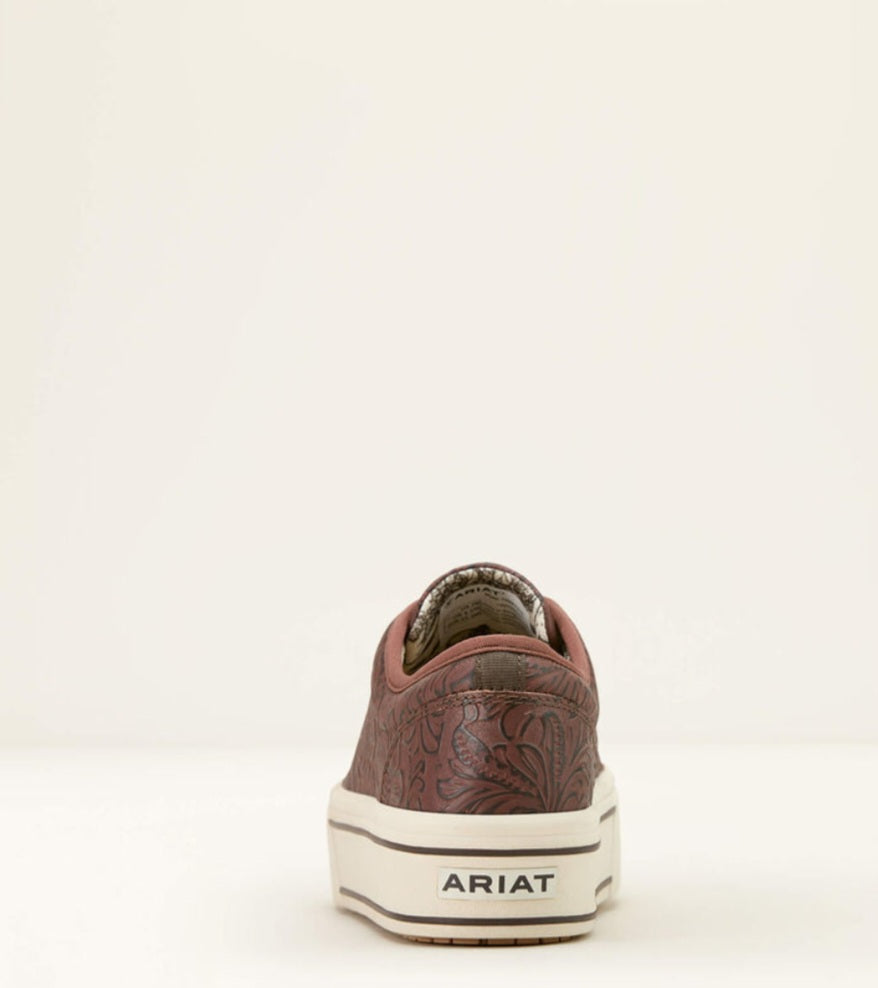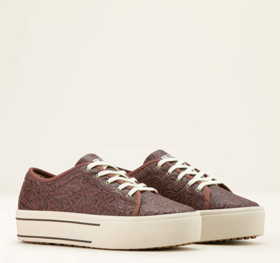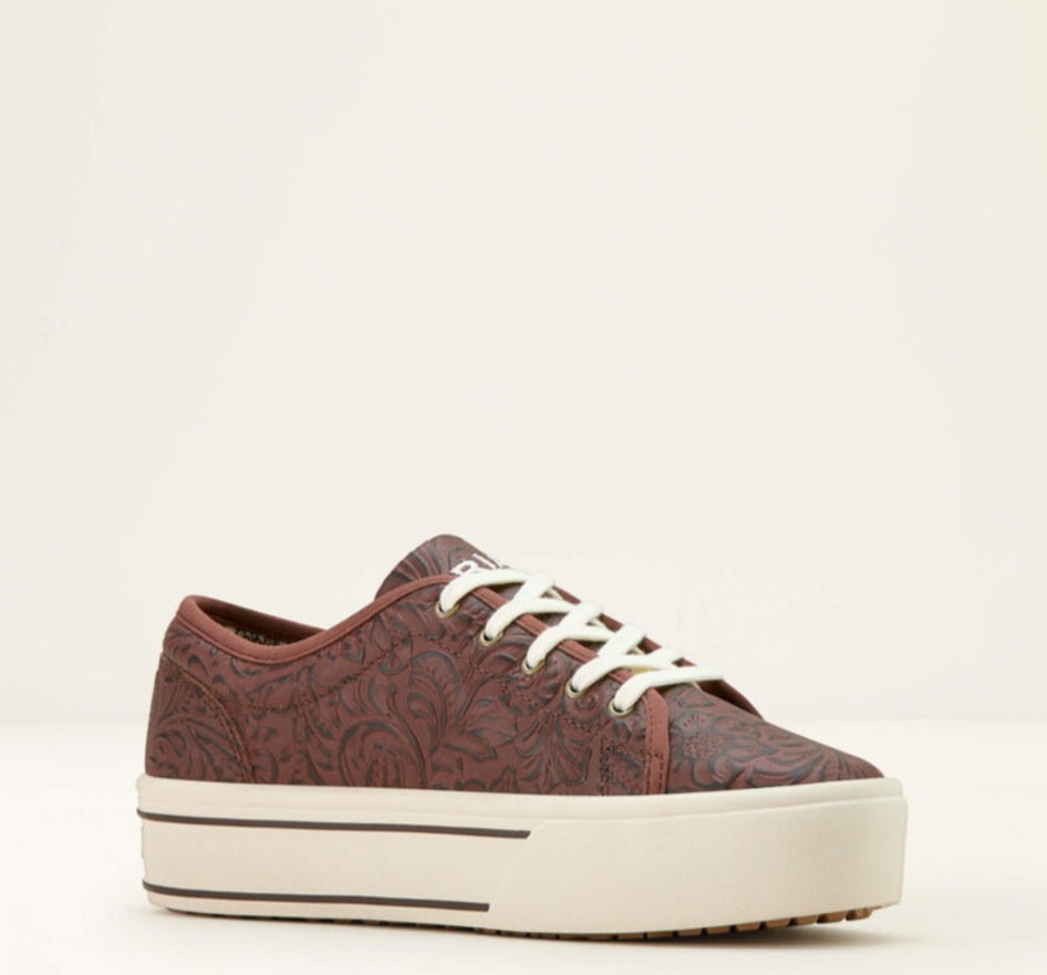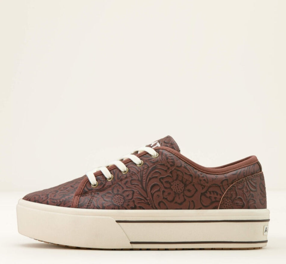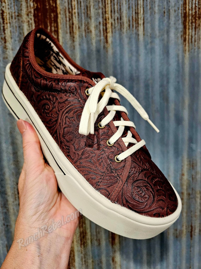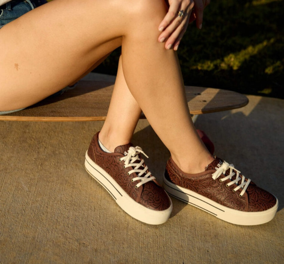 Lightweight & comfy, the Skylar shoe works just as easily with your casual looks as adding some fun to your dressed up looks. It has a lace top, cushioned insole & thick rubber sole. This one is brown with a tooled leather look floral emboss pattern.