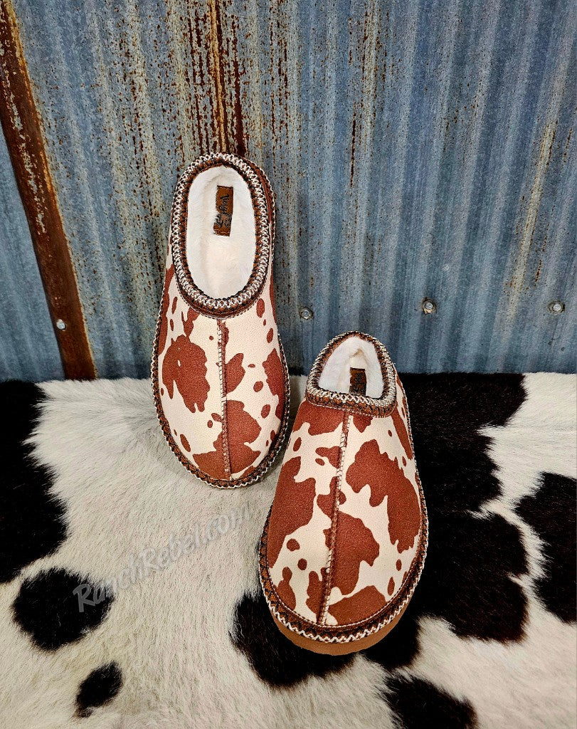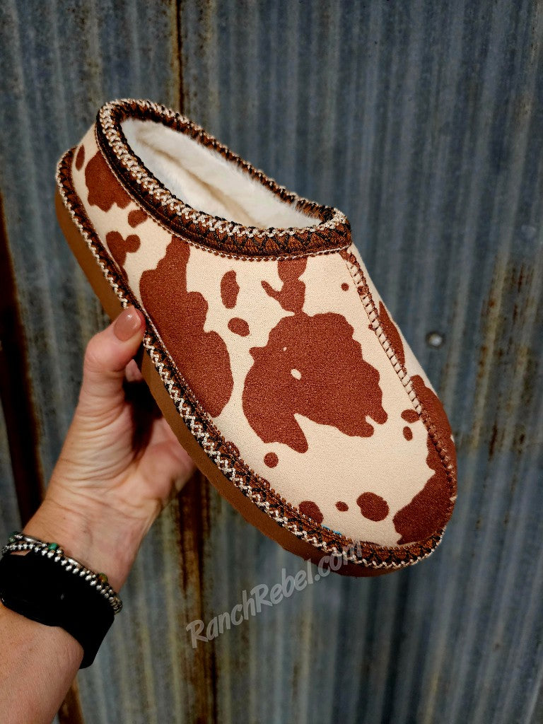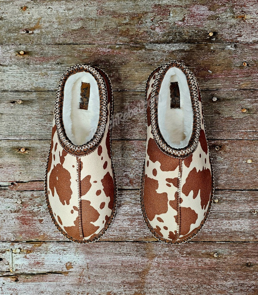 Cream & brown spotted faux suede slippers with soft & cozy faux fur lining. They have braided trim around the ankle & sole. Very lightweight, warm & comfy.