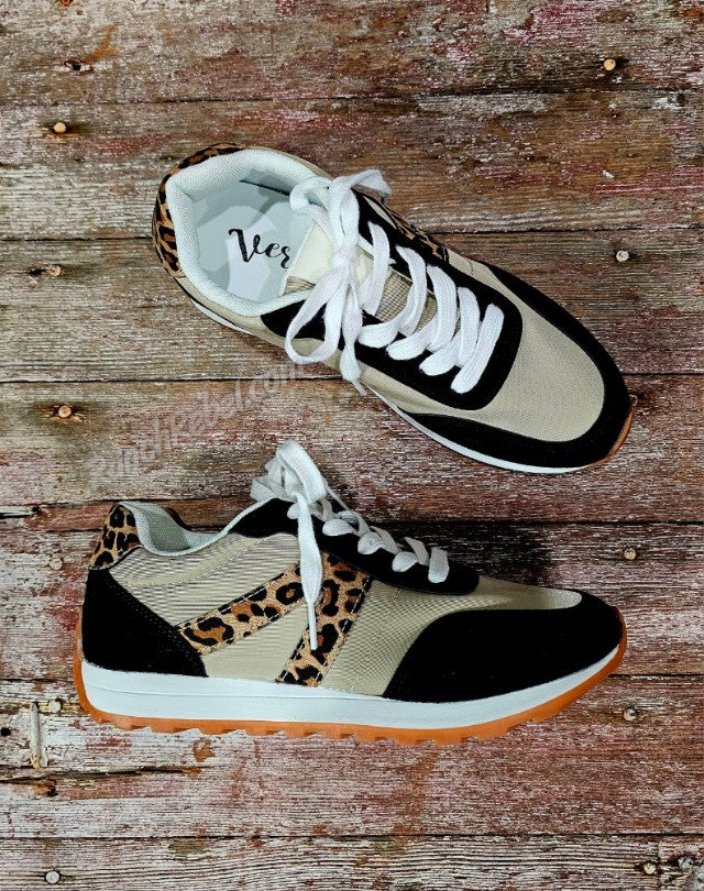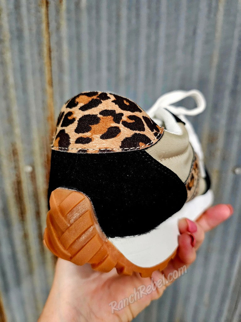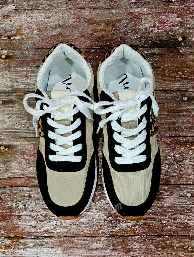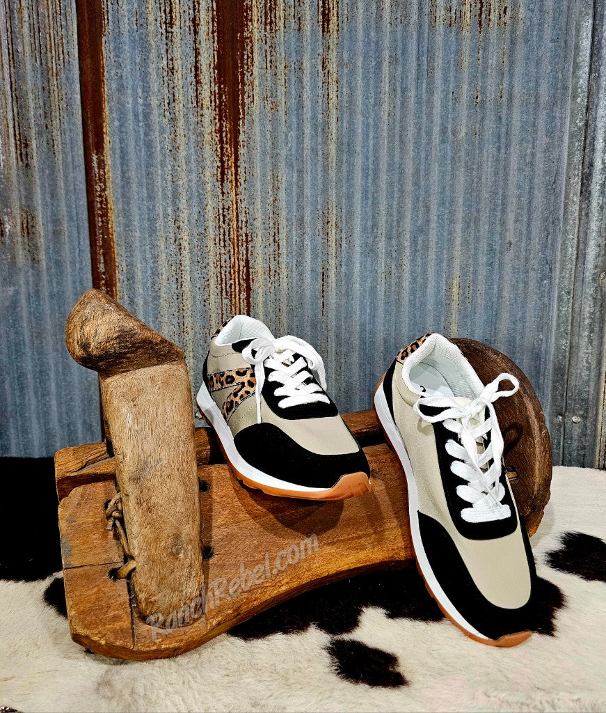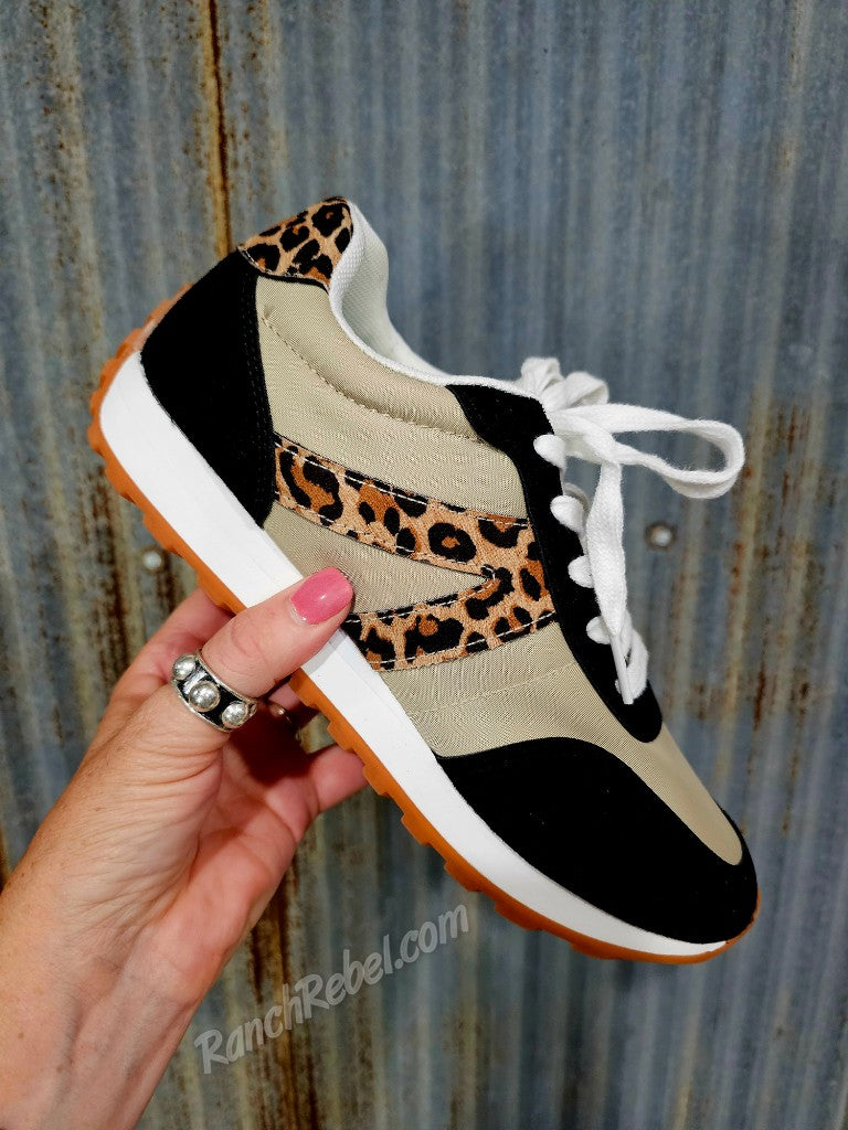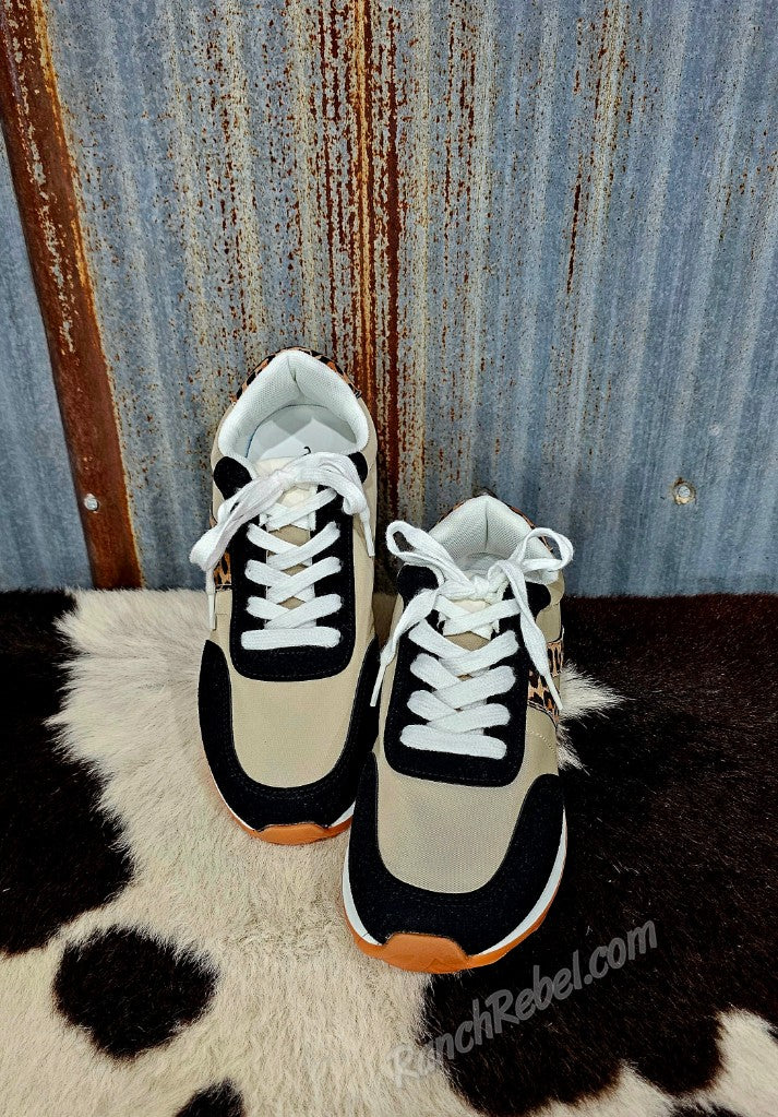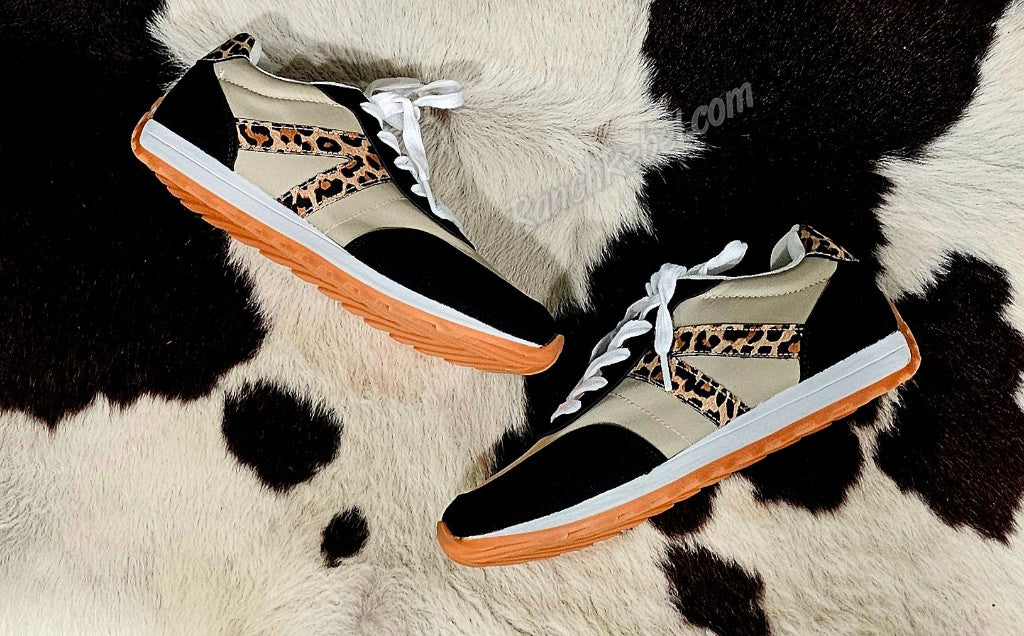 Sometimes life calls for sneakers & have we got a good pair! These have a fun retro look in a taupe colored nylon with black & leopard suede like accents. They have a white rubber sole & laces with a cushioned insole, padded tongue & ankle. Lightweight & in a color combo that will look cute with everything!