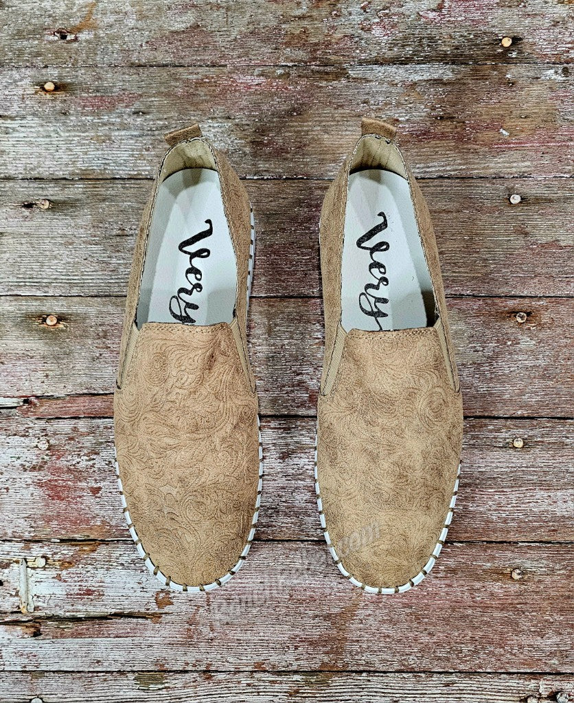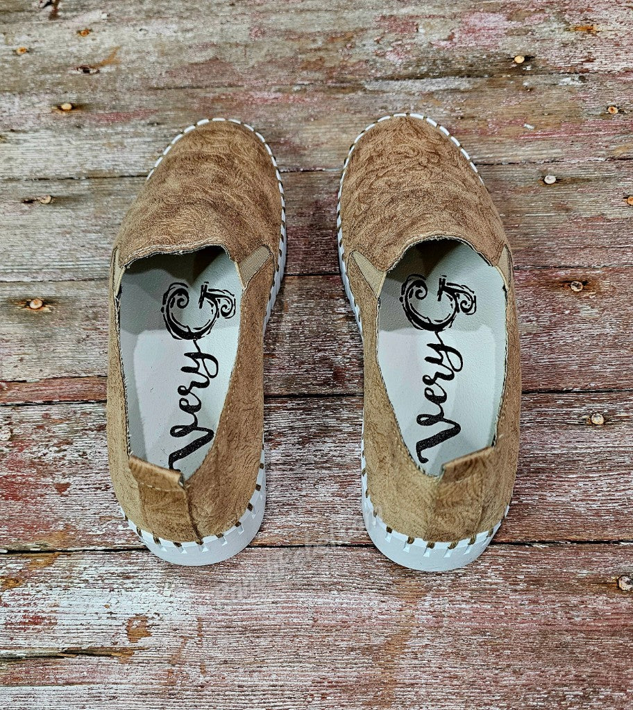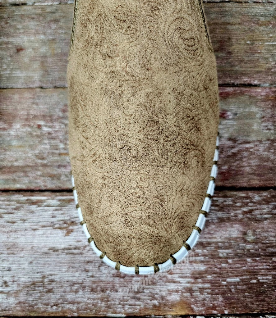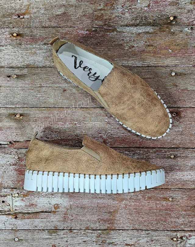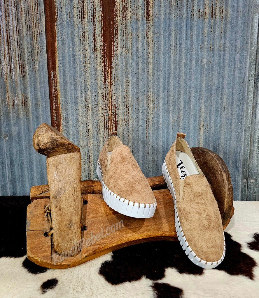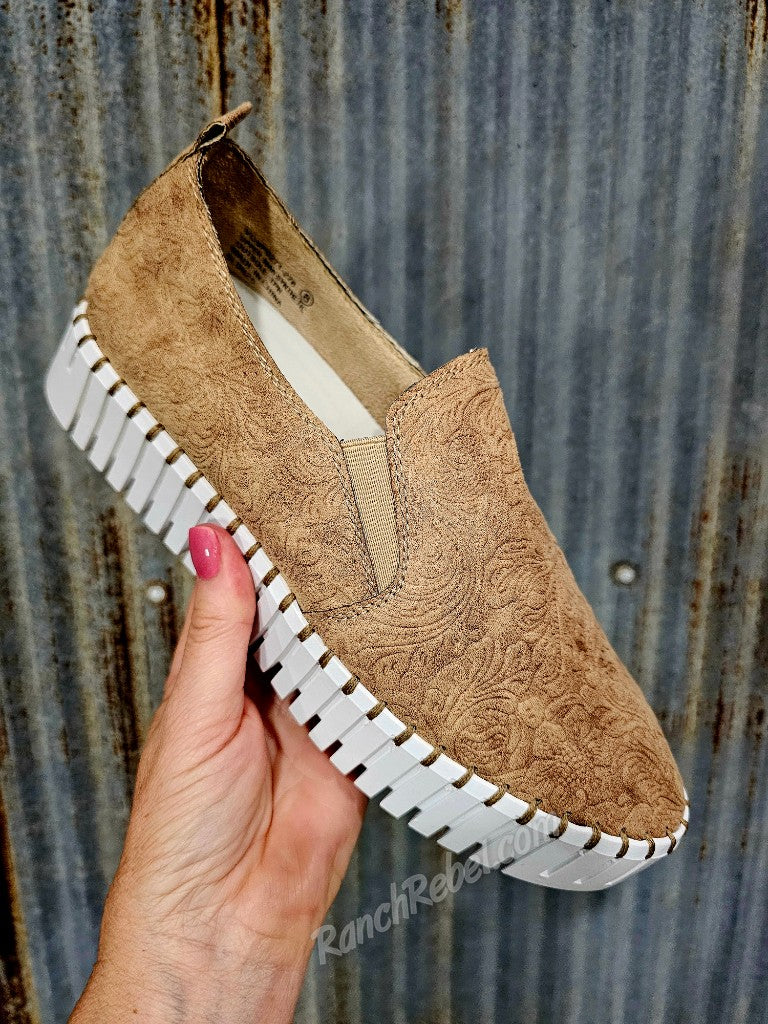 When great style & superb comfort come together, you get the Moxie! This cute & stylish slip on shoe is super flexible with a soft, suede like tooled upper in beige. The white platform sole adds a modern touch. These have a very cushioned insole & a back pull tab.