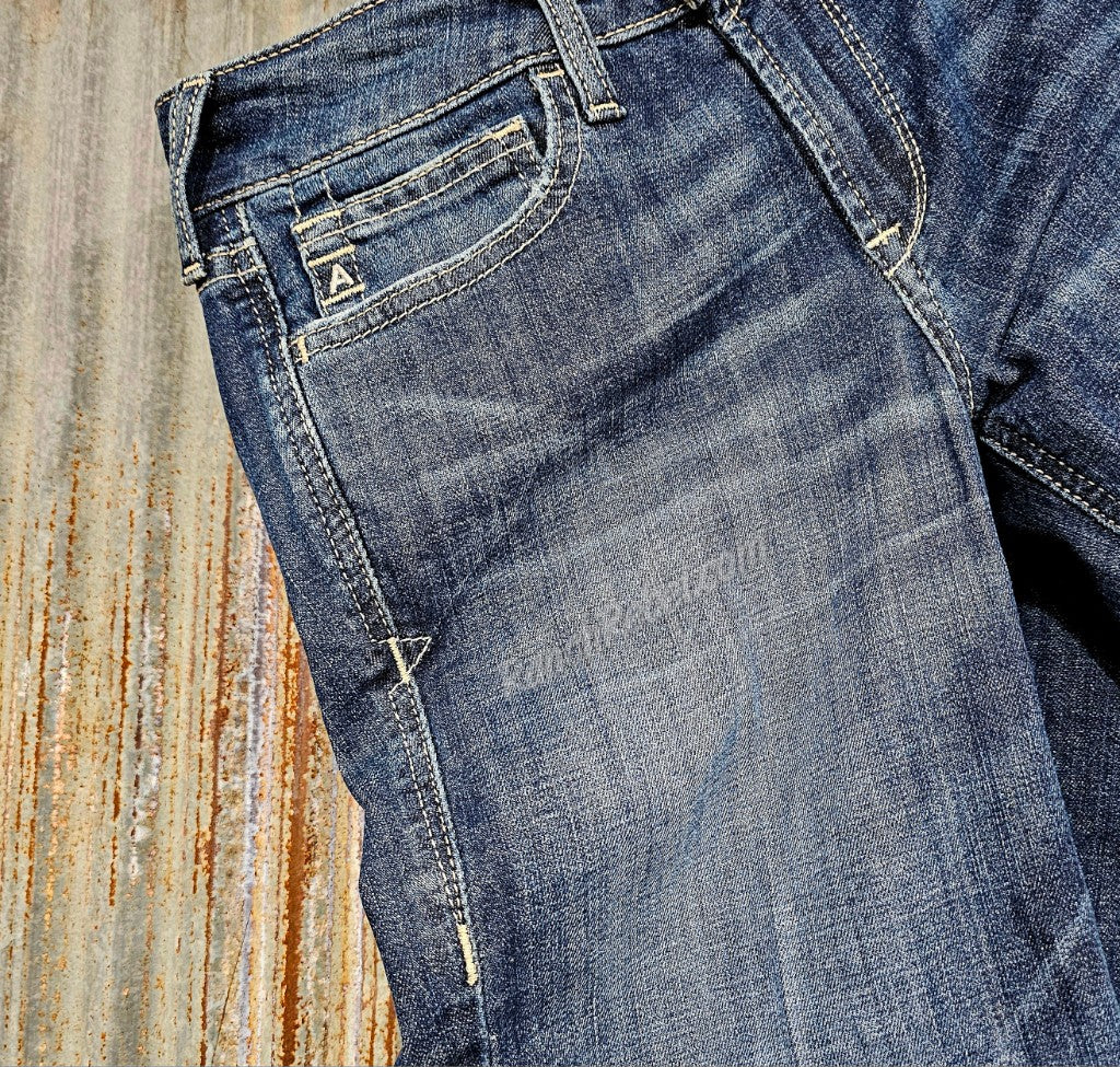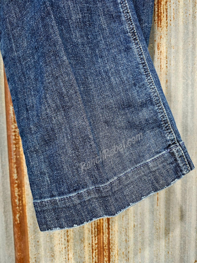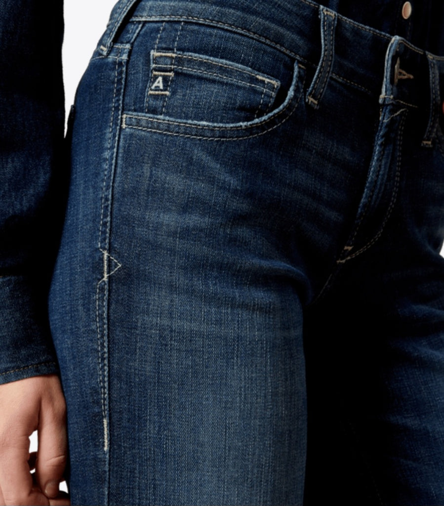 A dark wash trouser jean with the perfect rise waist that sits between a mid rise & high rise. They have navy stitched back pockets for a clean & timeless look. They have a relaxed, trouser leg with a wide bottom hem.