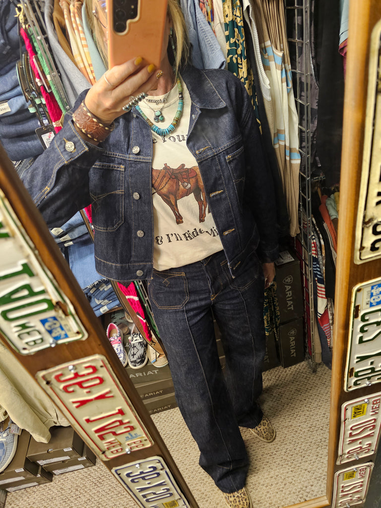 The darkest denim in a modern utility jean. These have an ultra high rise with a button fly front, outer front pockets with sorrel colored western stitching on the front & back pockets. They have a pintuck front seam with extra wide bottom cuffs that can be turned up for a cropped style.