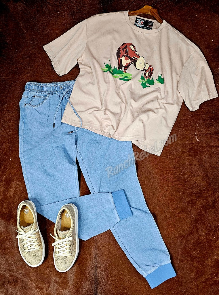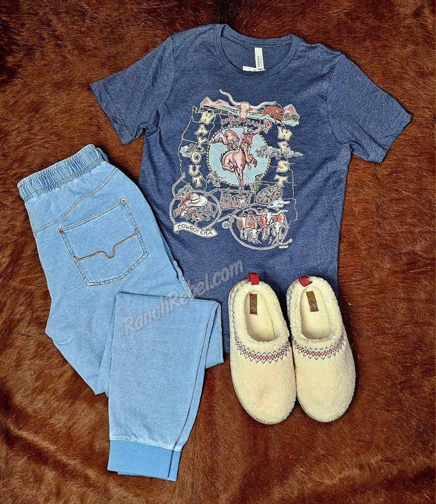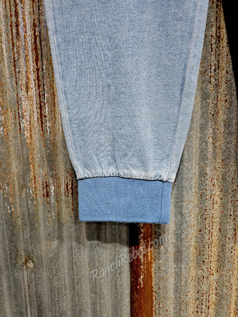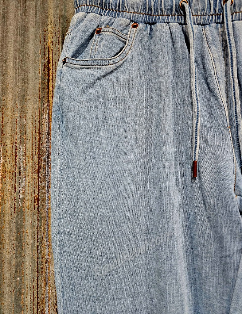 Western Uncomplicated. Soft, stretchy knit joggers in a light indigo color with brown stitching. They have an elastic waist with a drawstring, front pockets with a coin pocket, rib knit cuffs at the ankles, a back western yoke & back pockets with copper rivets at the top corners & brown embroidered horn logos.