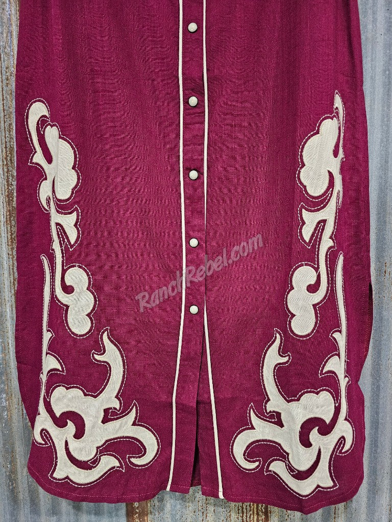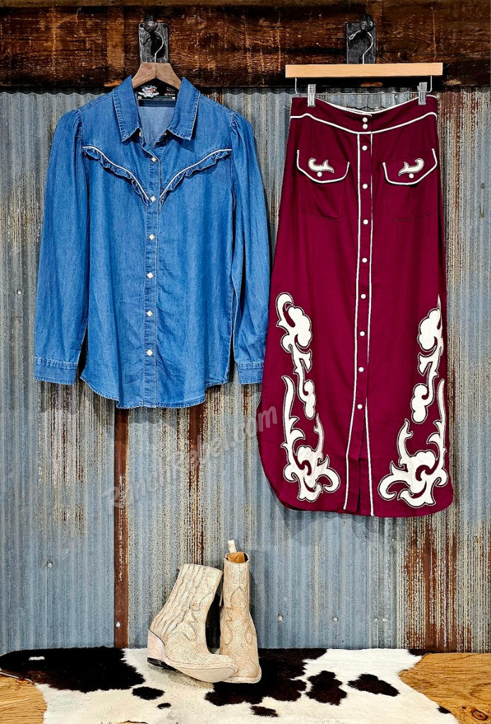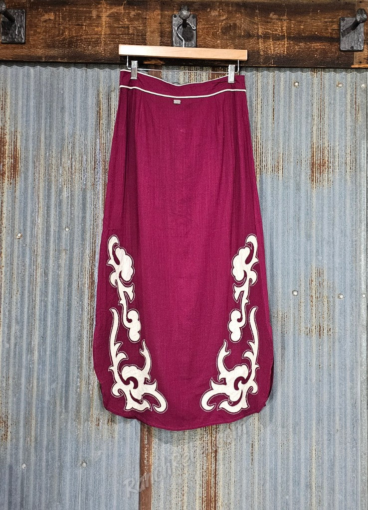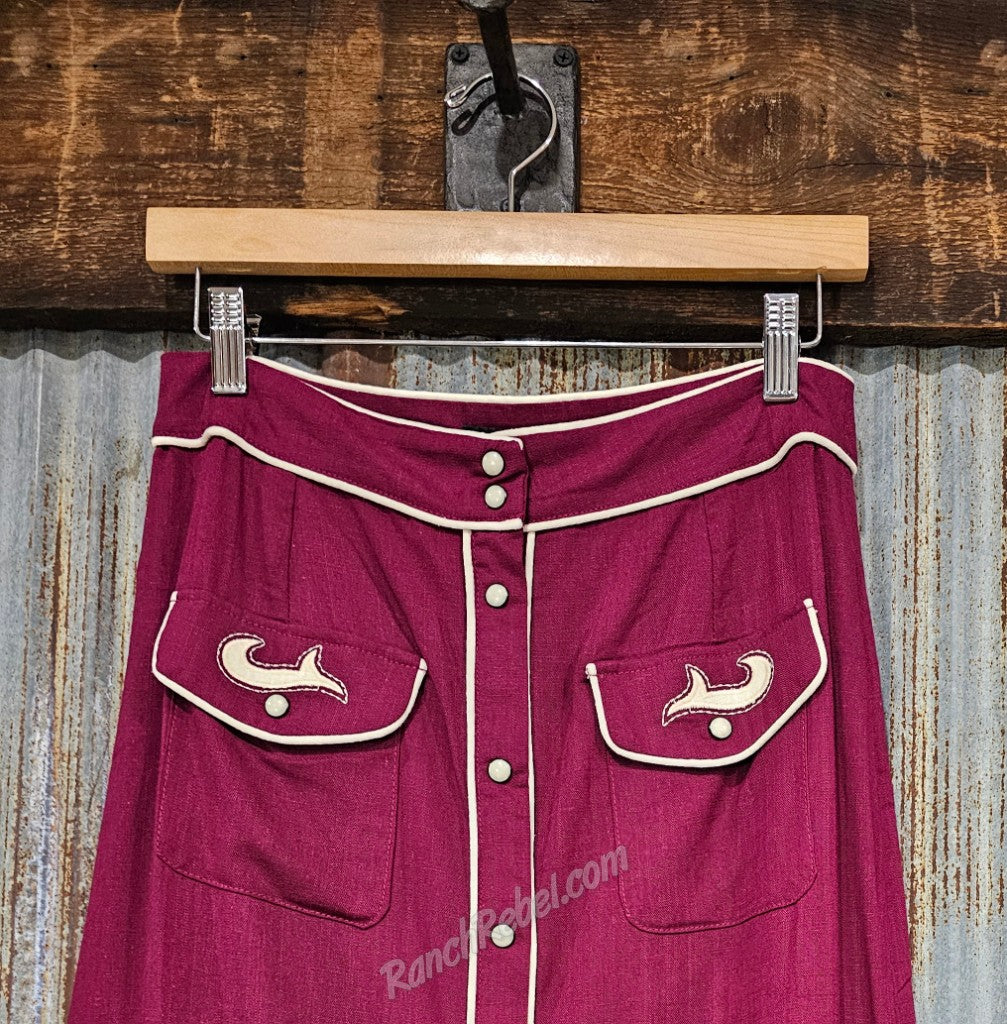 A rich, wine colored, longer skirt with cream colored bootstitch appliques.  It has a snap front with cream colored pearl snaps, cream colored piping details & functional front flap pockets.  It has 9" split sides with a slightly rounded bottom hem.