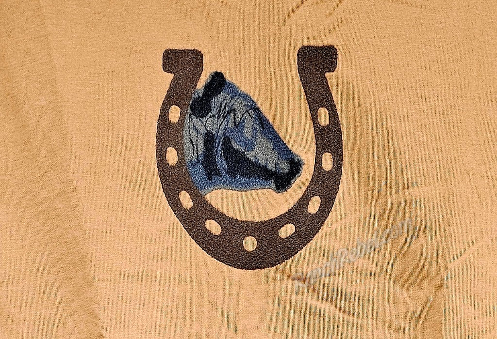 A golden brown colored hoodie with a cute & unexpected plaid ruffle at the bottom hem.  The front has an embroidered horseshoe & Angus.  It has a draw string hood & rib knit trim at the cuffs.