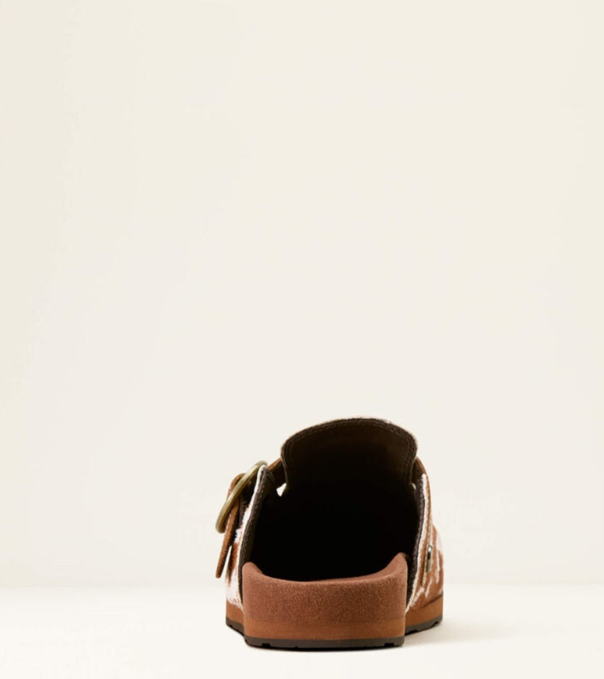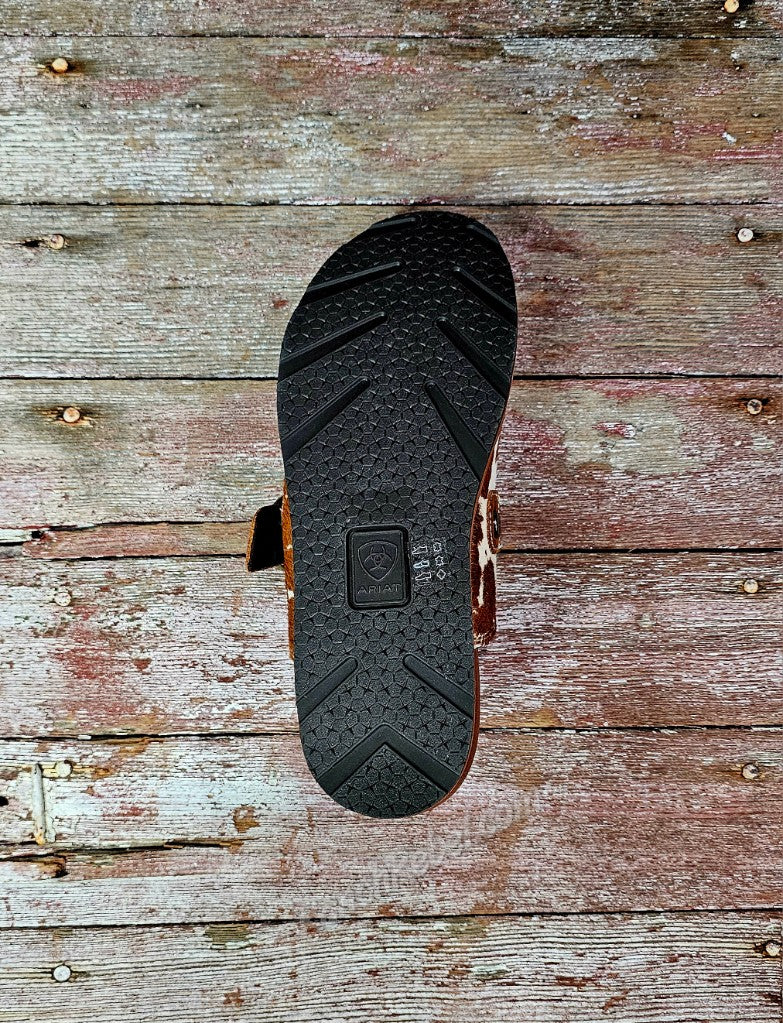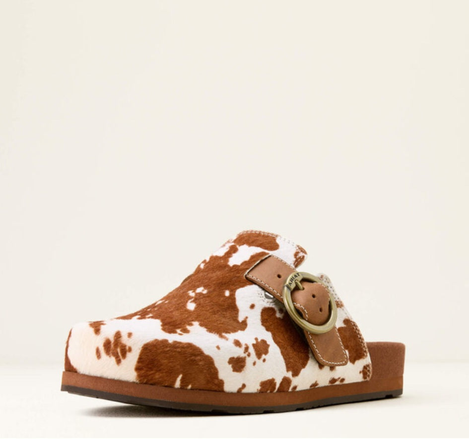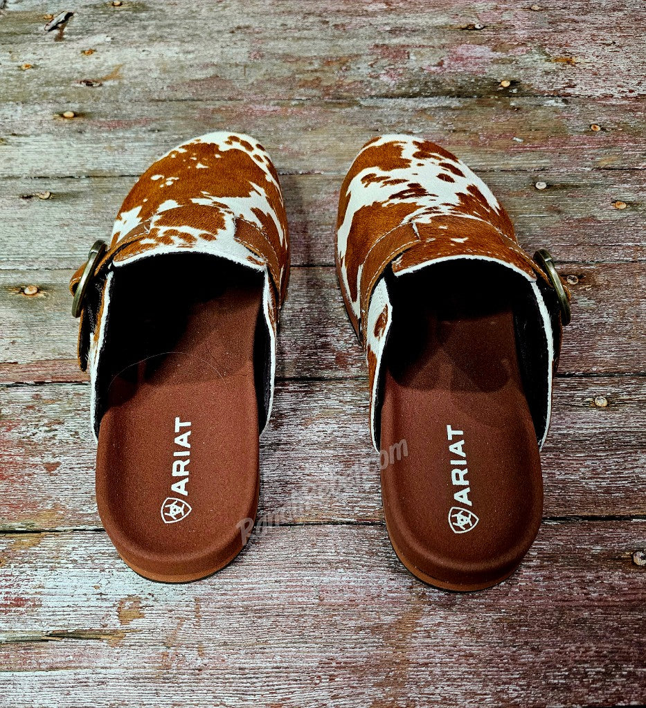 Very comfortable slip on mules with a cut out footbed with arch support.  The uppers are brown & white dyed hair on hide.  They have an adjustable leather strap with a brass buckle.