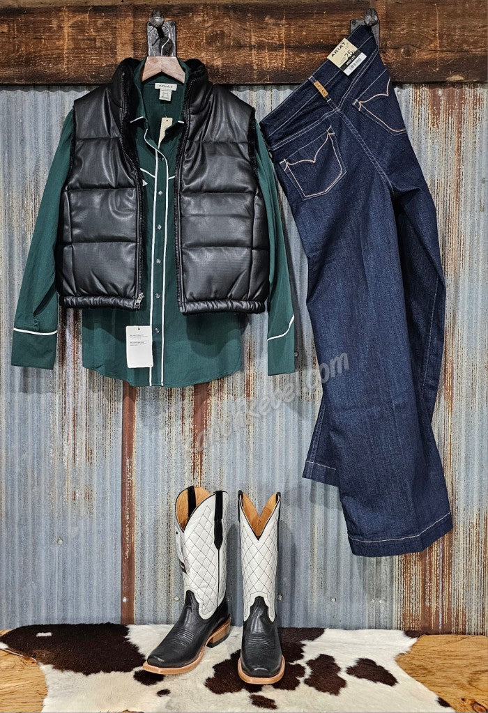 Get more bang for your buck with this cute, reversible, puffy vest! One side is black faux leather, the other side is black faux fur. It has a zip front, elastic waist, hand pockets on each side, with one side snapping shut, & a stand up collar. Slightly cropped.