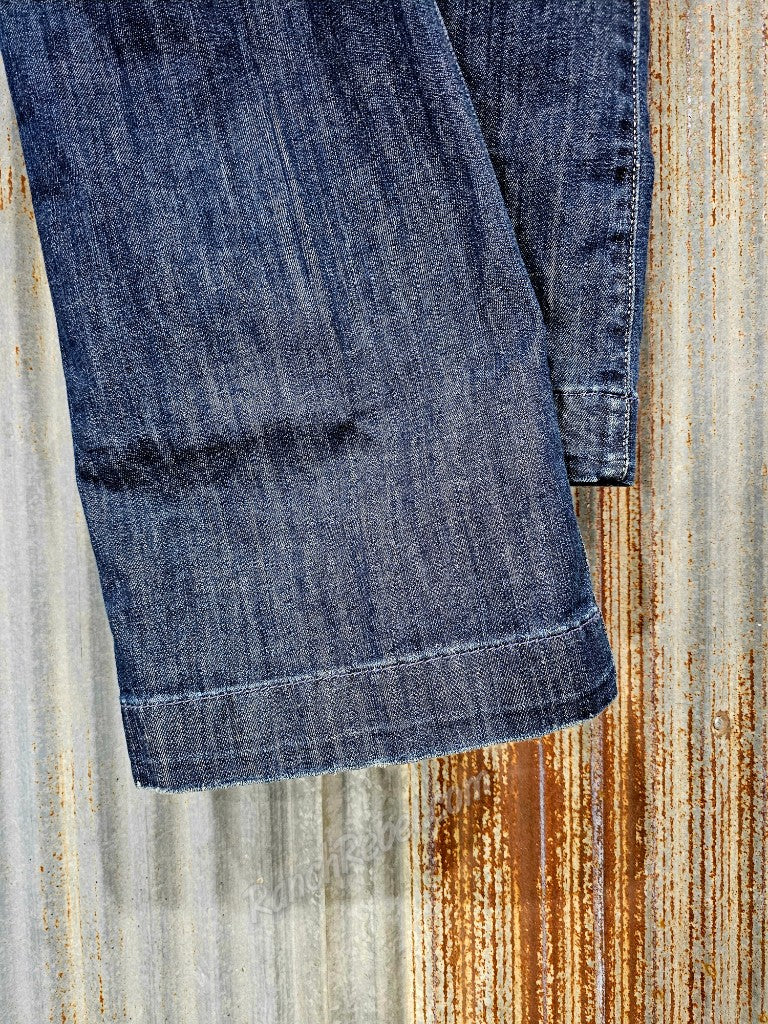 A dark wash, high rise slim trouser with simple diagonal back pocket stitching. They fit slim through the thigh, gradually widening from the knee to the wide bottom trouser hem. A classy pair of jeans.