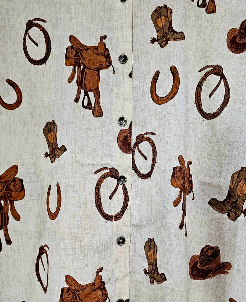 A thin weight button up shirt with a rustic Saddle, Boot, Rope, & Horseshoe print in shades of brown on a natural colored background. It has three button cuffs & a slightly rounded bottom hem. This is a dressier shirt that works well alone, as well as layered under things, or over & open like a jacket. Great for year round wear.