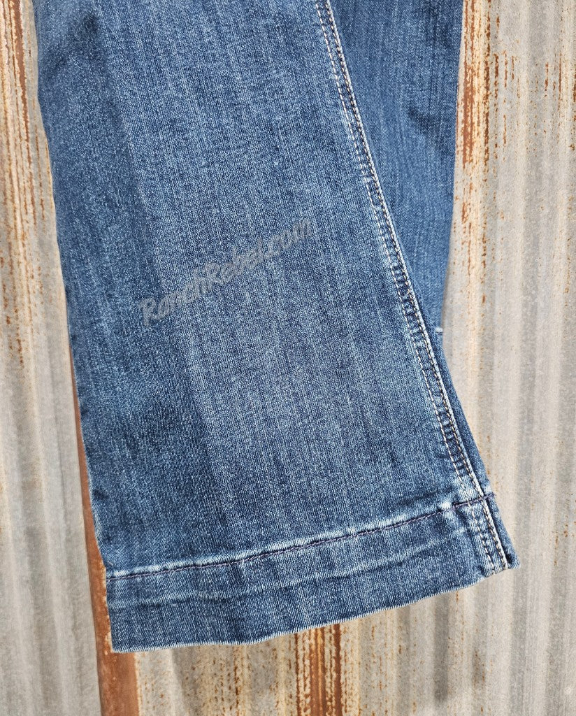 A mid wash slim trouser with the perfect rise waist. It has 3D & laser detailing with tan saddle stitching on the back pockets & the trouser hem at the bottom.