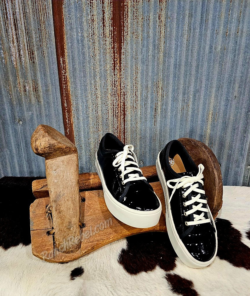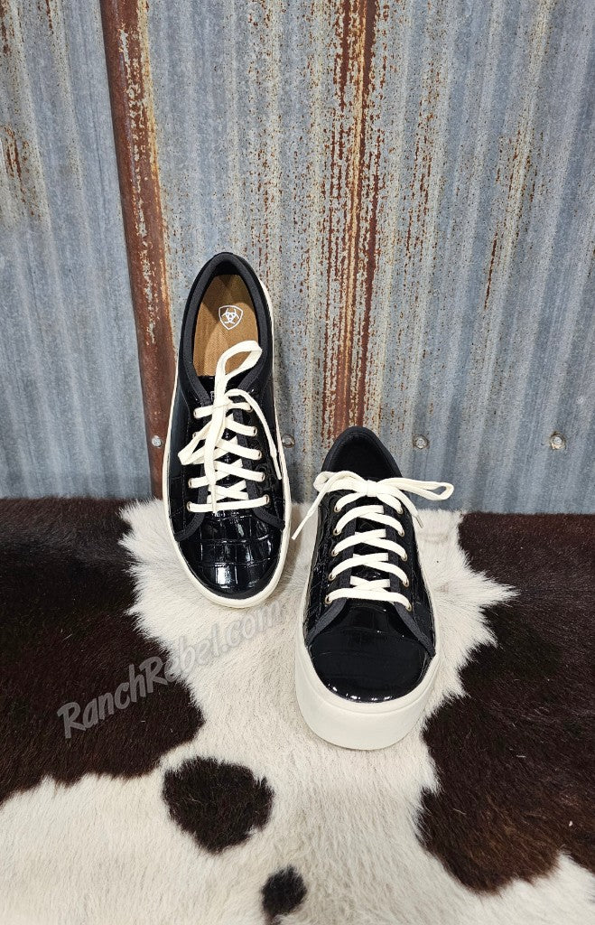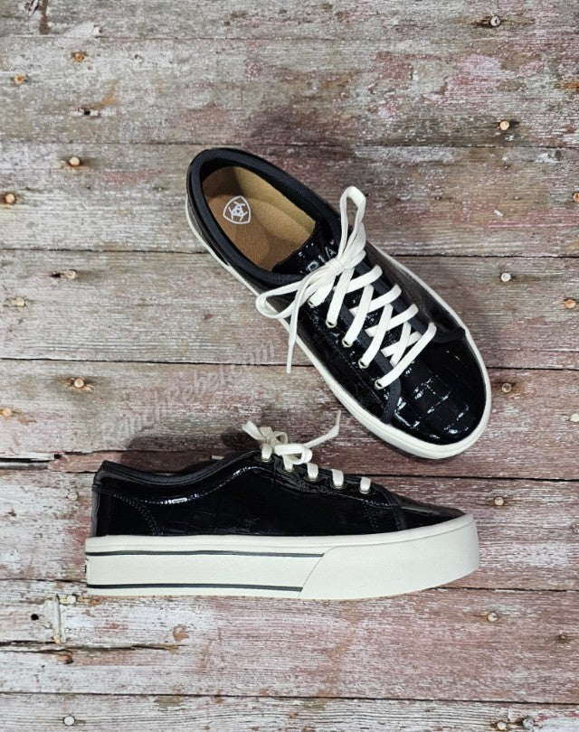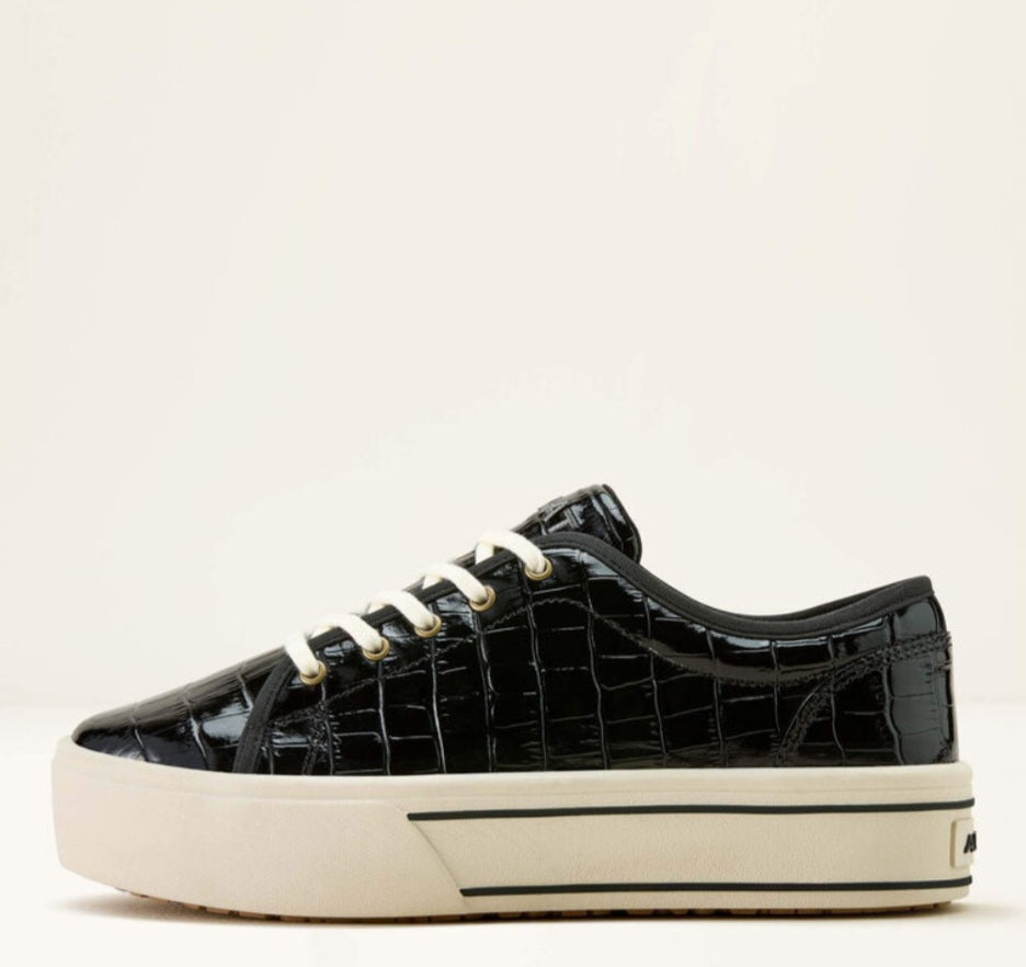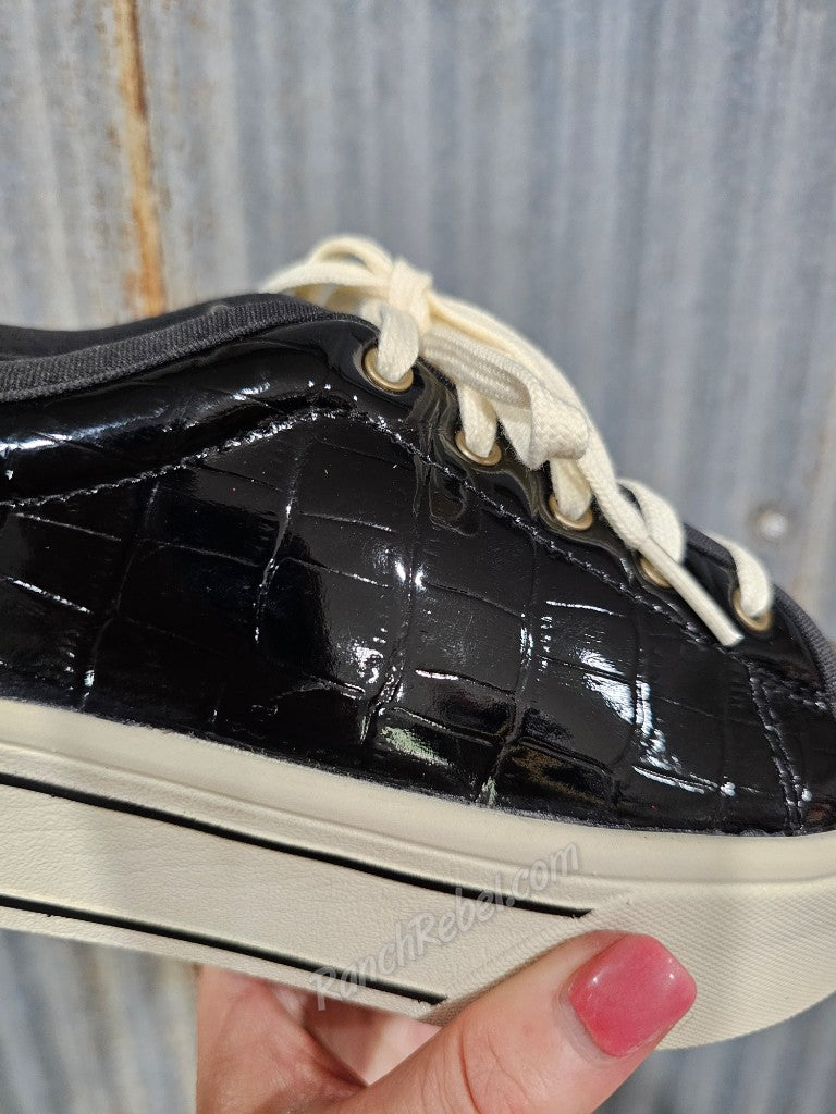 Lightweight & comfy, the Skylar shoe works just as easily with your casual looks as adding some fun to your dressed up looks. It has a lace top, cushioned insole & thick rubber sole. This one is a black patent croc print.