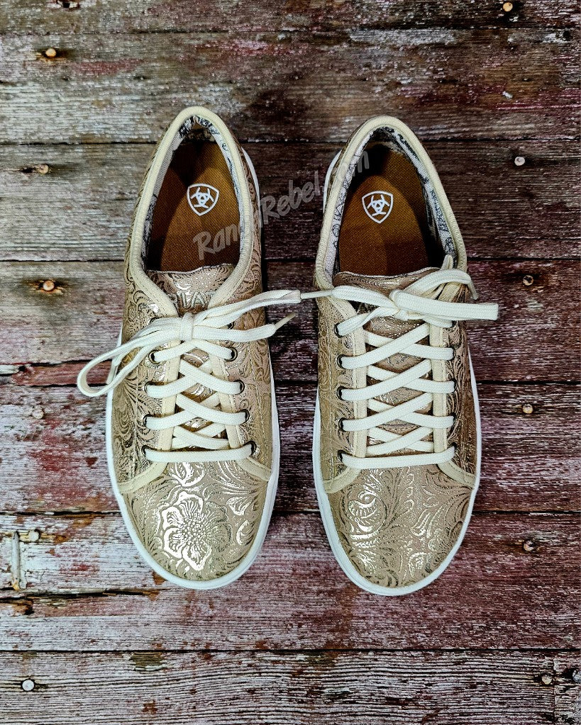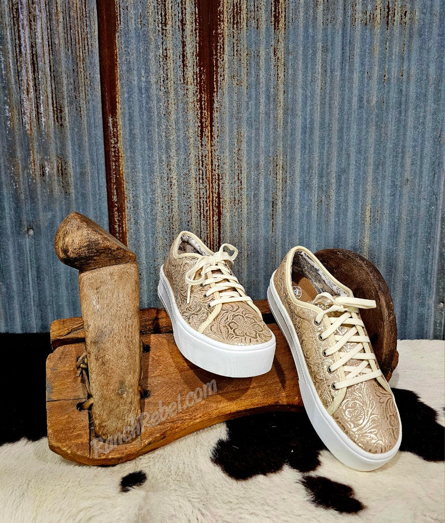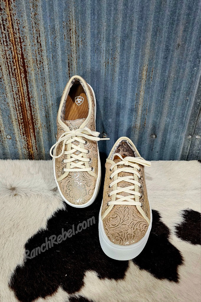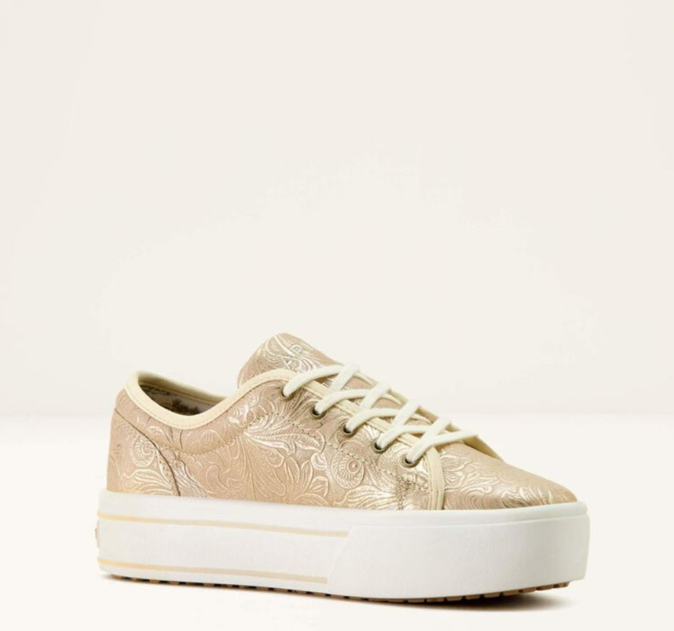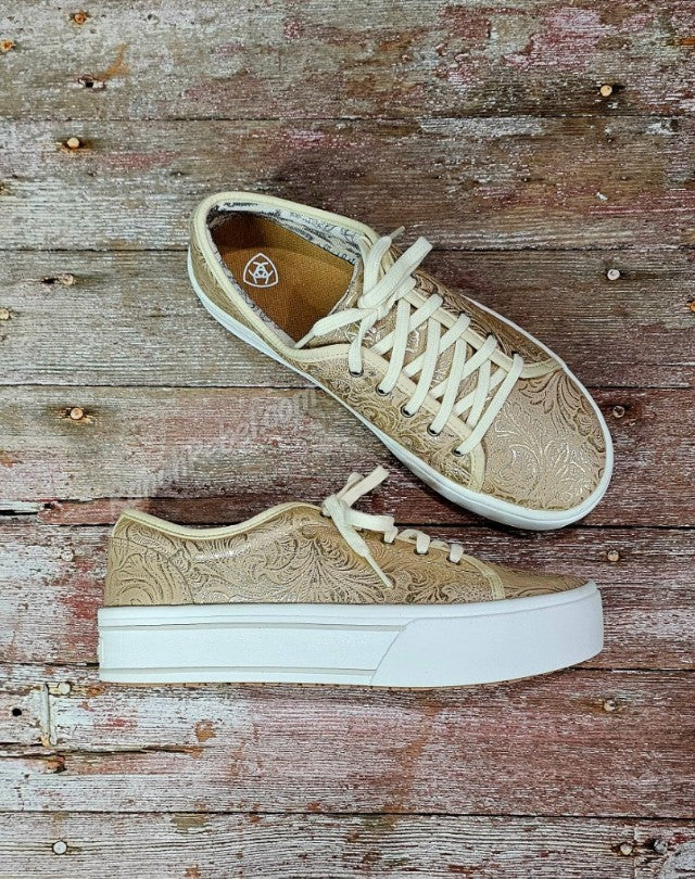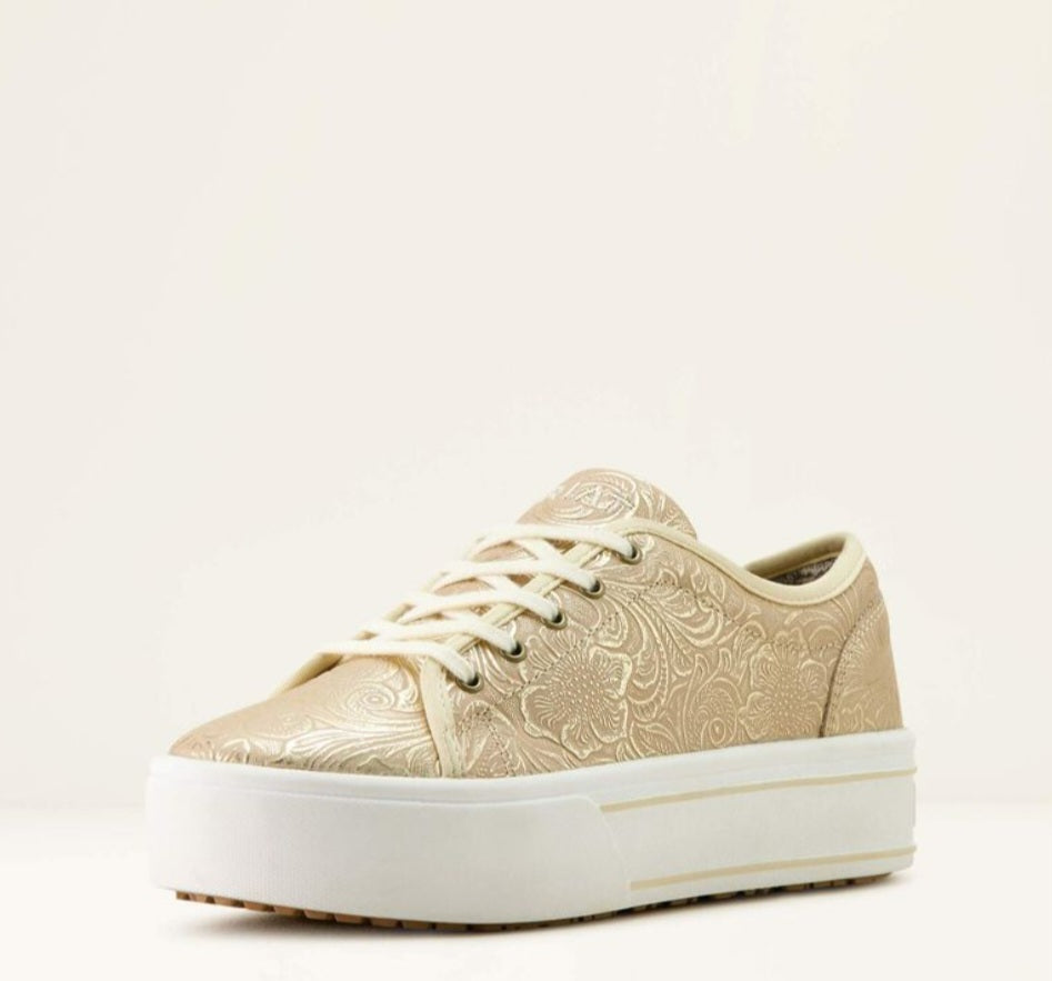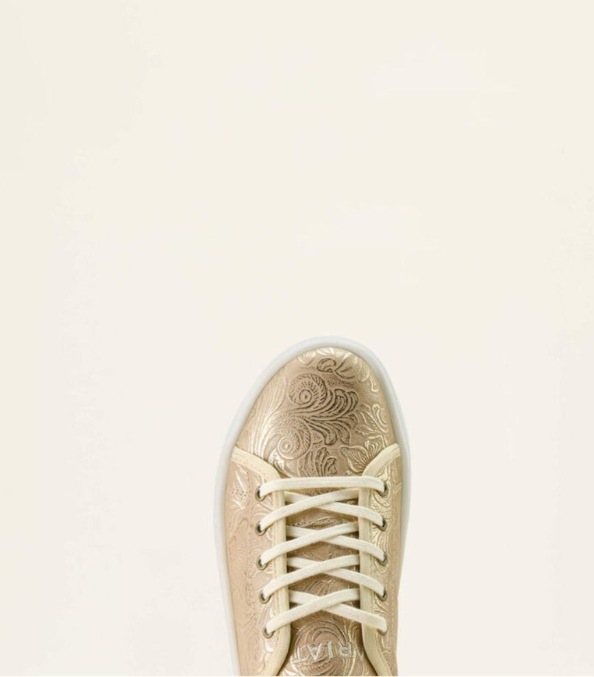 Lightweight & comfy, the Skylar shoe works just as easily with your casual looks as adding some fun to your dressed up looks.  It has a lace top, cushioned insole & thick rubber sole.  This one is a golden pearl color with a floral emboss pattern.