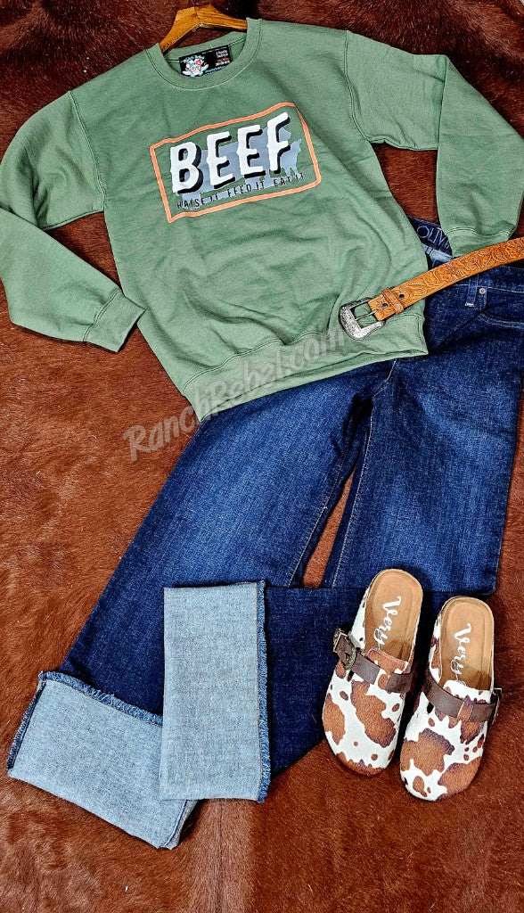 An olive colored, fleece lined sweatshirt with a crew neckline & rib knit cuffs & bottom hem.  It has a cow/calf graphic on the front that says BEEF.  Raise It.  Feed It.  Eat It.