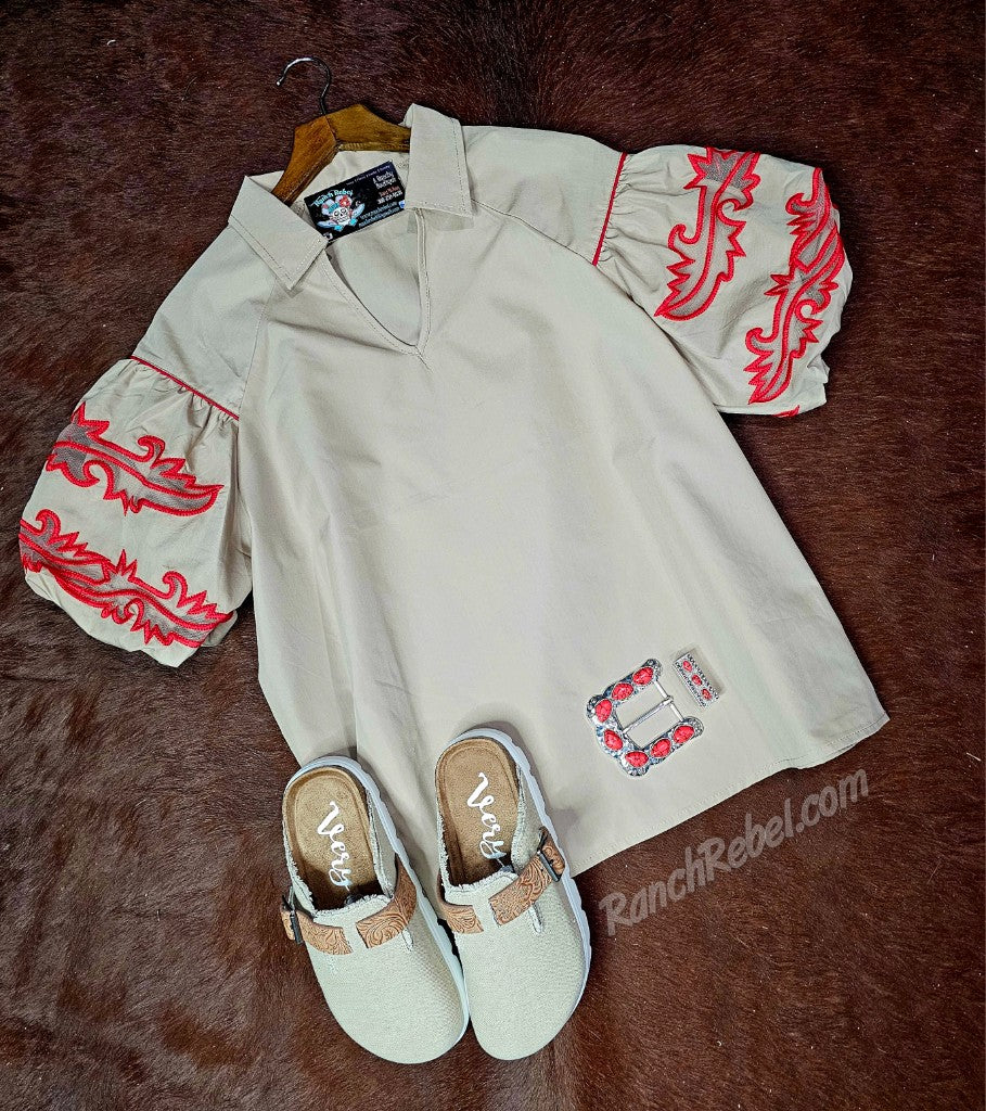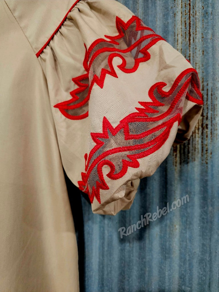 A tan colored woven top with a notched v neck & collar. Short, puffy sleeves with gathers & red bootstitching with mesh inserts. The body has a flowy fit without much stretch.