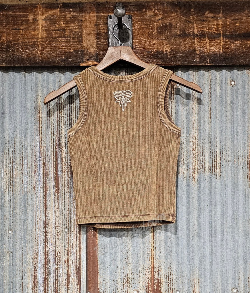 Mineral washed for an aged look. This brown ribbed tank has white fancy bootstitch embroidery on the front & a tinier version on the back at the neckline. It has a crew neck, modest armholes & a cropped length. The perfect piece for layering under things, working out, or in the heat of the summer!