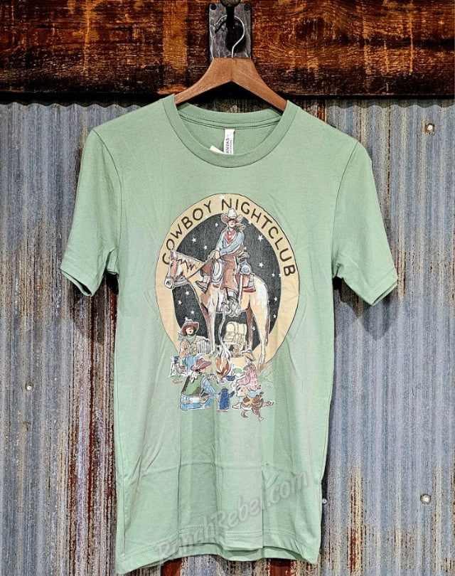Cowboy Nightclub features a retro cowboy campfire graphic printed on a sage colored crew neck tee.