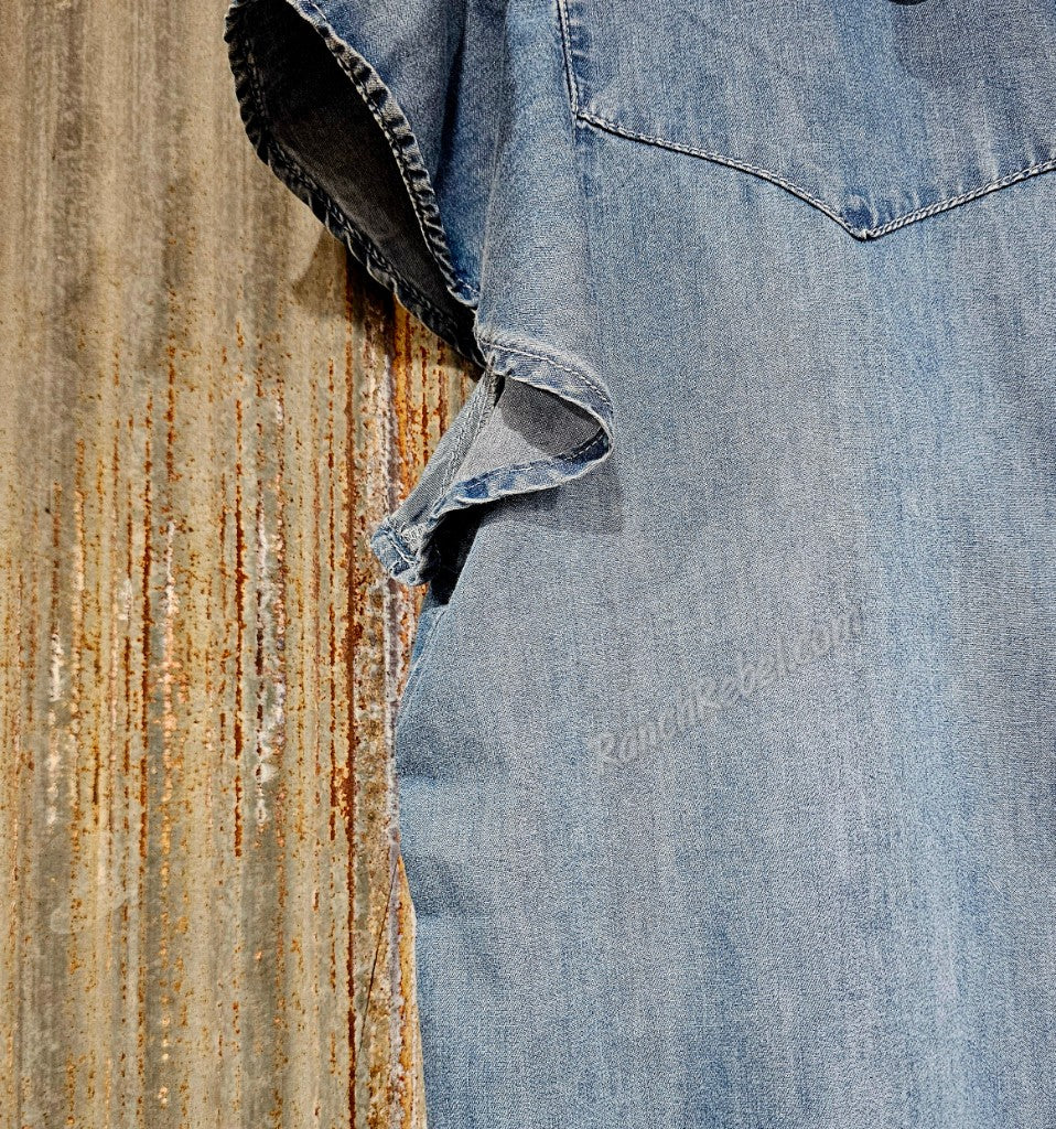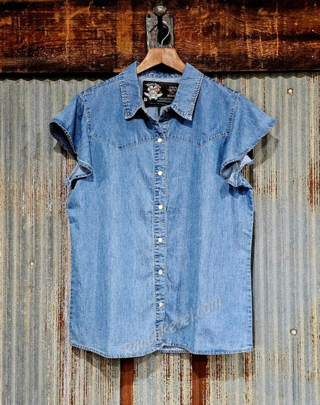 You loved the light denim one & now there's a darker version. A lightweight, flowy denim top with a pearl snap front, front & back western yokes & short, flutter sleeves. A great layering piece, & one that will look great with everything.