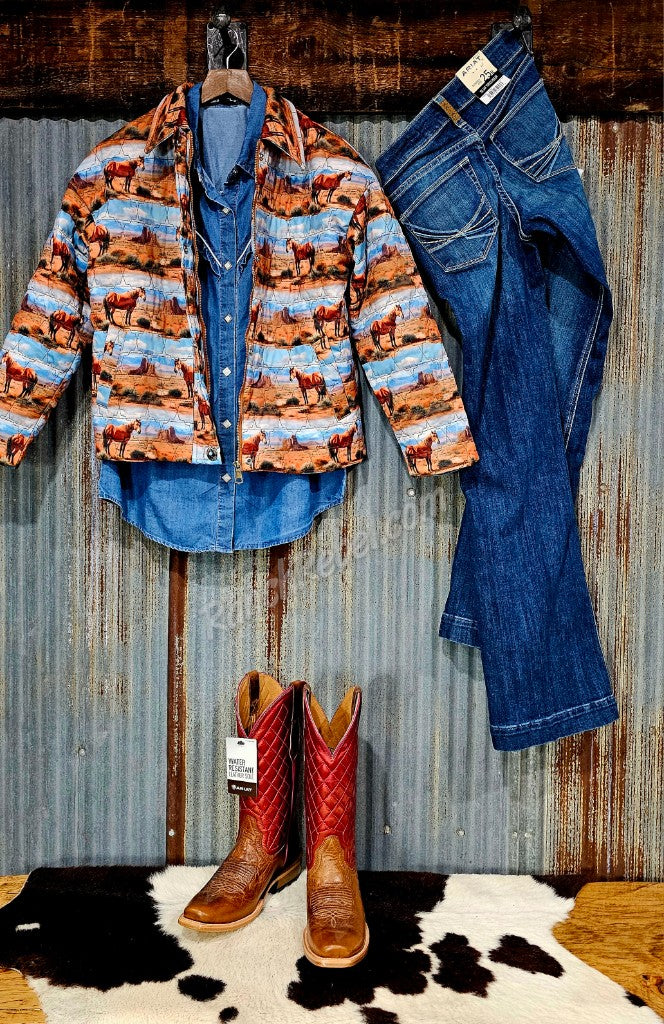 A lightweight denim shirt with a front & back western yoke with white piping & a small ruffle outlining the yoke. It has diamond shaped pearl snaps on the front placket & single button cuffs. A great wardrobe staple for the western woman.