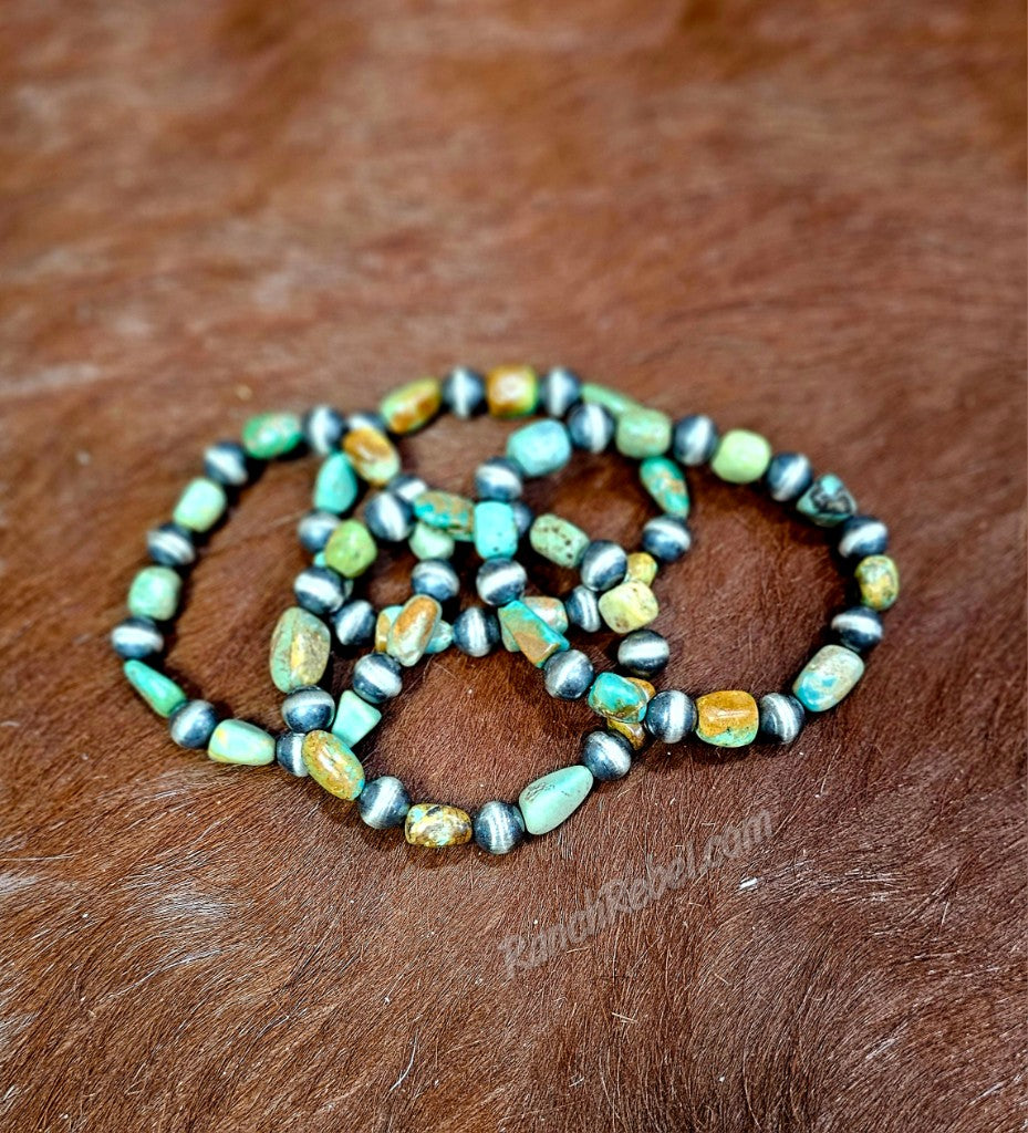 Green Turquoise & Sterling Silver Pearl Stretch Bracelet #6324