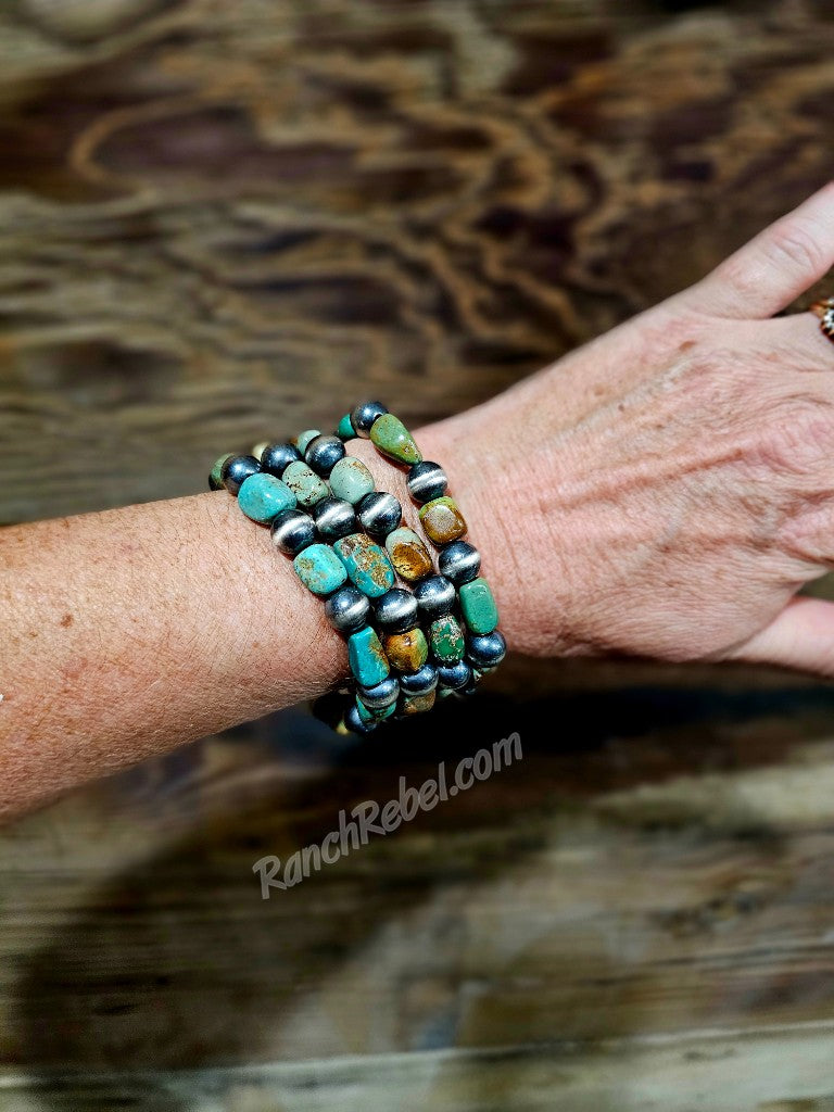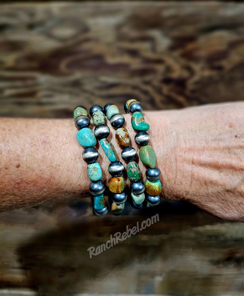 Wow! Large 10mm sterling silver pearls alternate with green turquoise nuggets on this stretch bracelet. The turquoise has a lot of color variation with browns, jade & mostly green turquoise.
