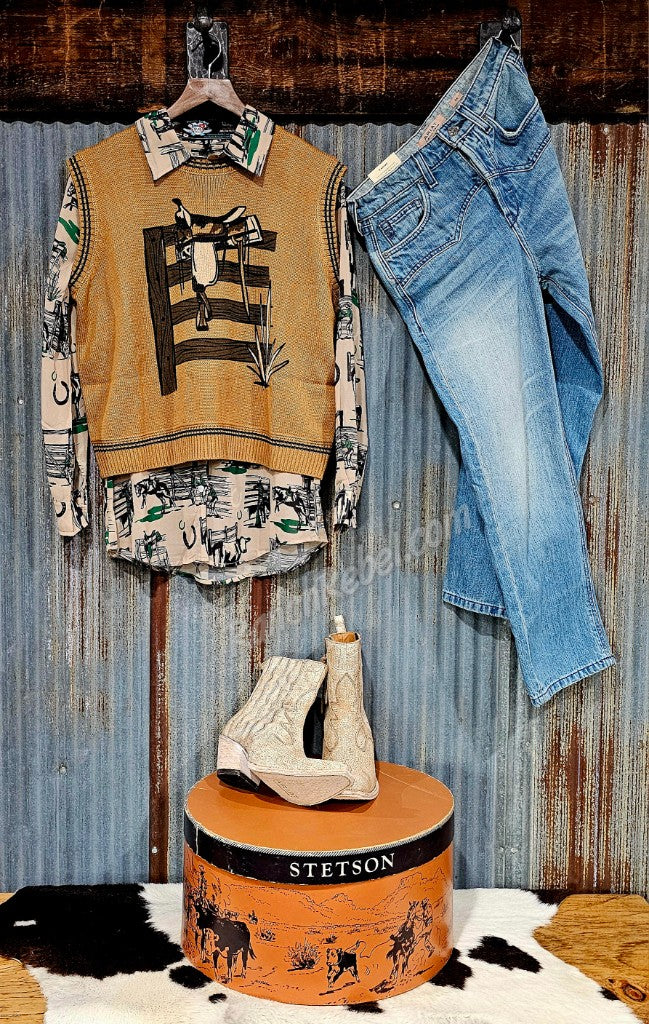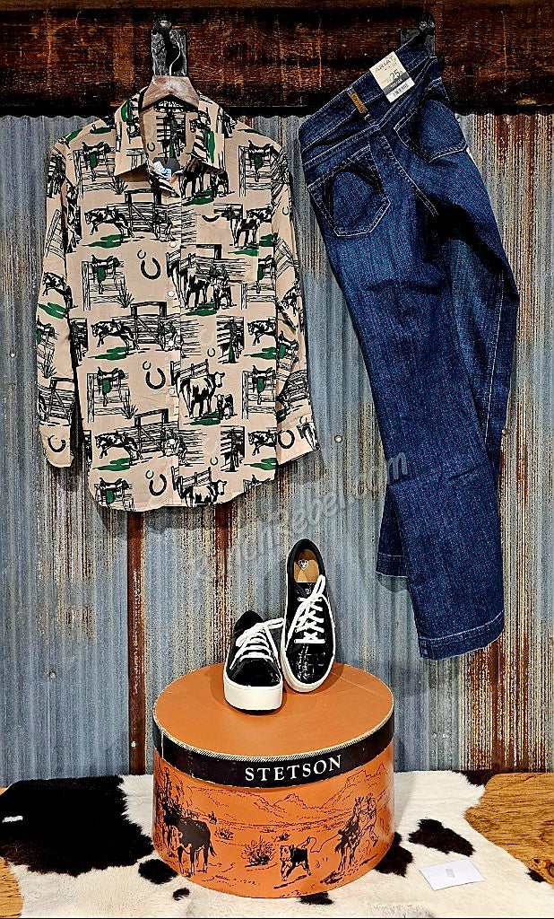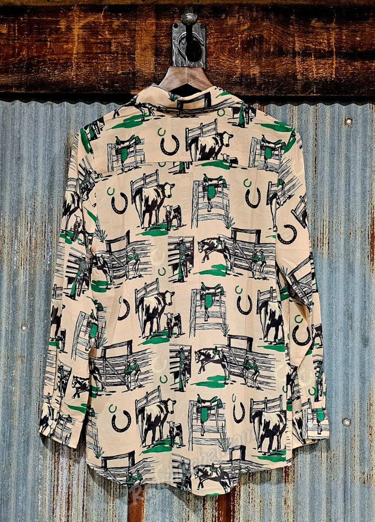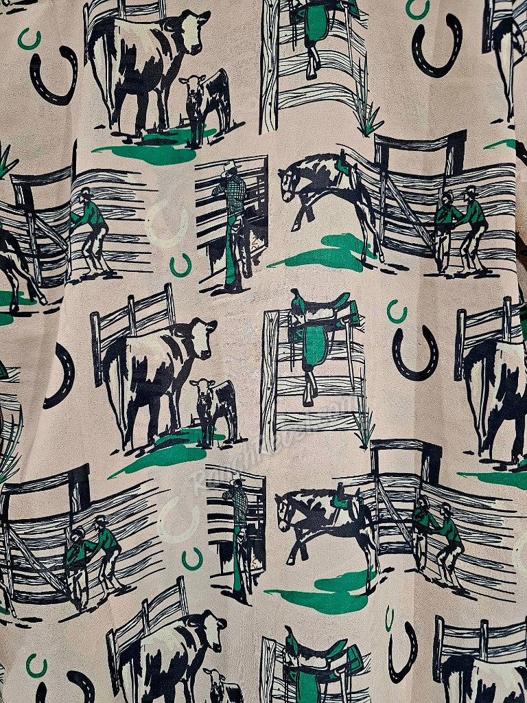 A light tan colored top with black & kelly green retro ranch graphics. It has a pearl snap front, double snap cuffs & slightly rounded bottom hem.
