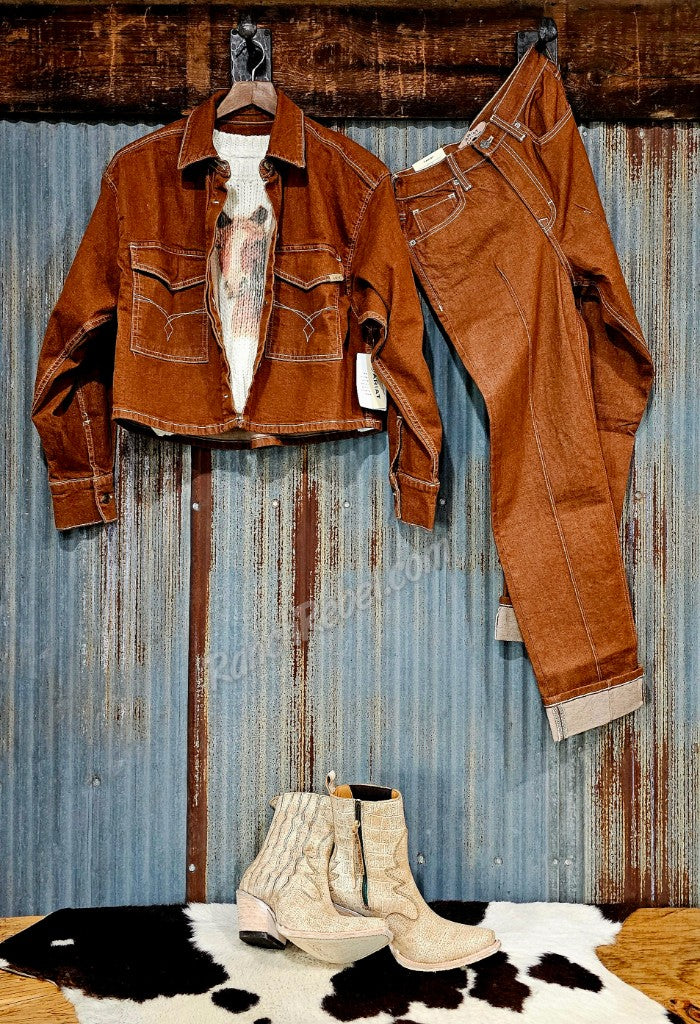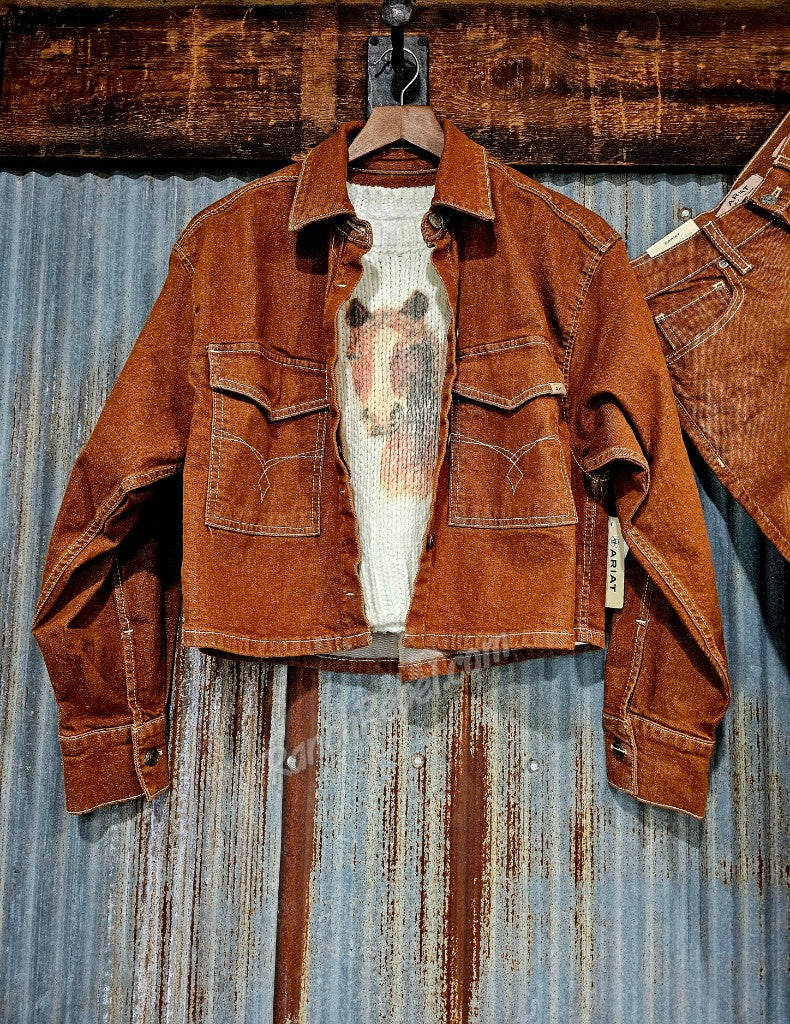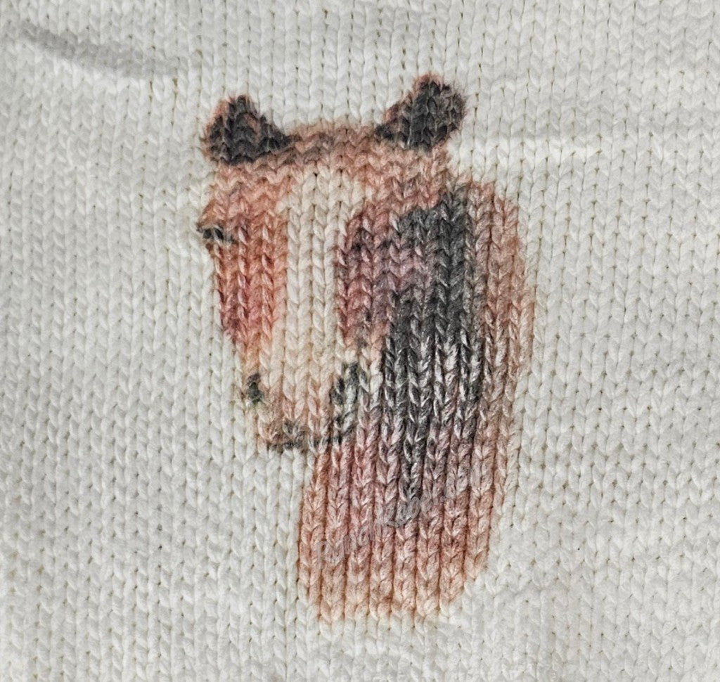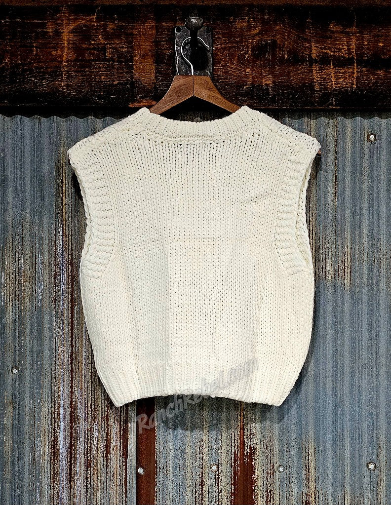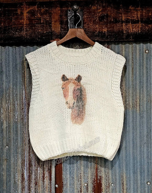 A chunky knit sweater vest in off white with a detailed horse head knit into the vest. It has contrast knit at the sleeves, neckline & bottom hem.