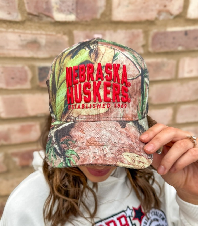 A camo cap with red, raised embroidery. NEBRASKA HUSKERS established 1869.