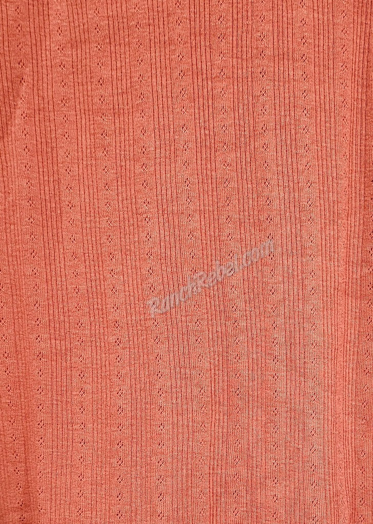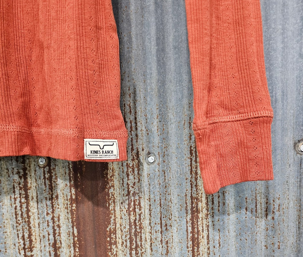 A lightweight pointelle knit henley in a rust color thats perfect for Fall. It has five white buttons at the neckline with exposed stitching at all the hems. A great layering piece.