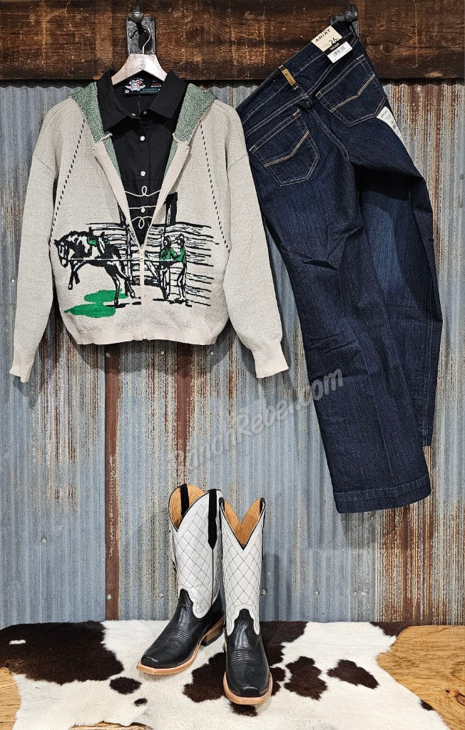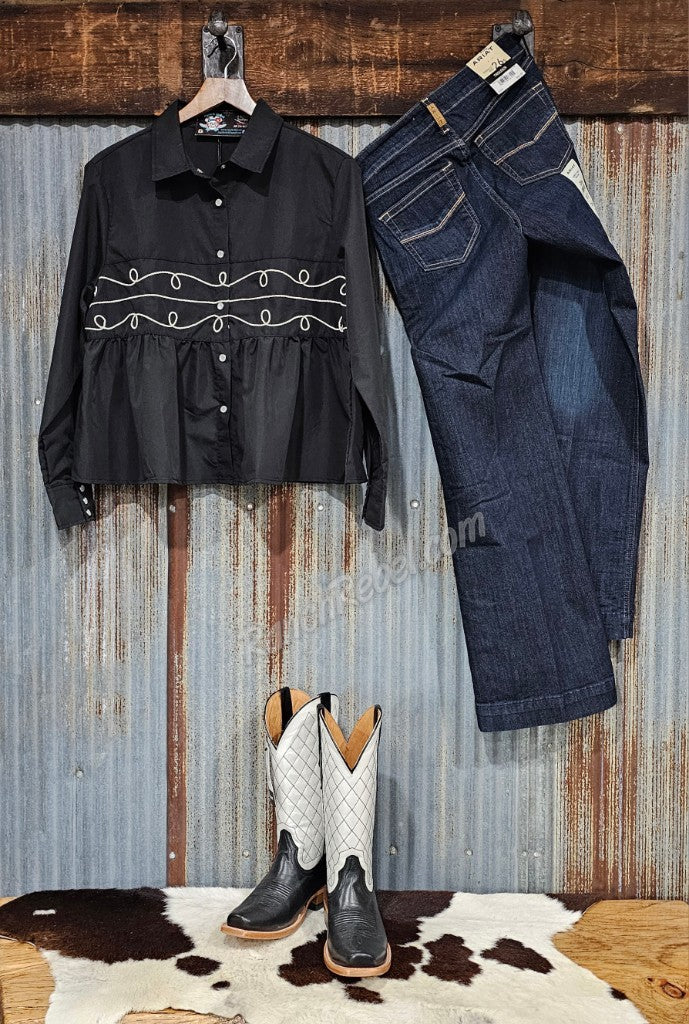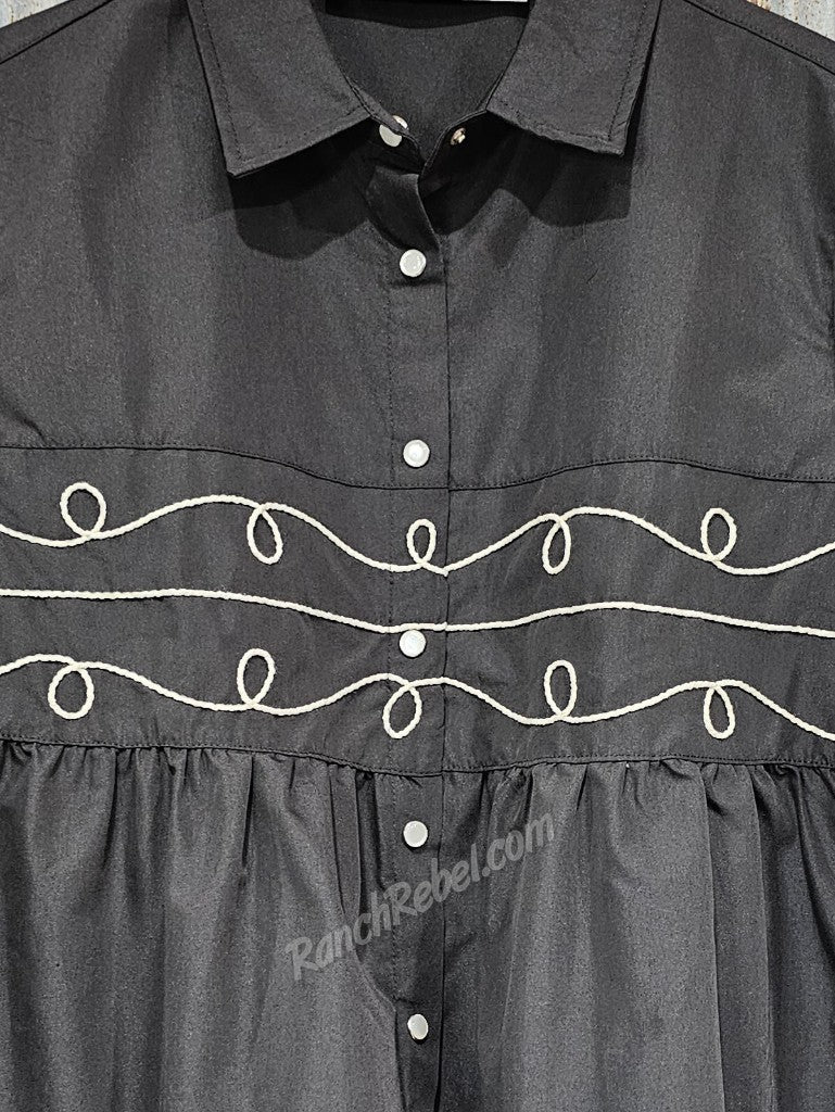 A fun top with a lot of versatility. It has a snap front, three snap cuffs & a mid panel with thin rope loops sewn in place. Below that is a wide ruffle panel. This is cute over graphic tees & tanks worn as a jacket, or under vests, sweater vests, sweatshirts, sweaters & cardigans.
