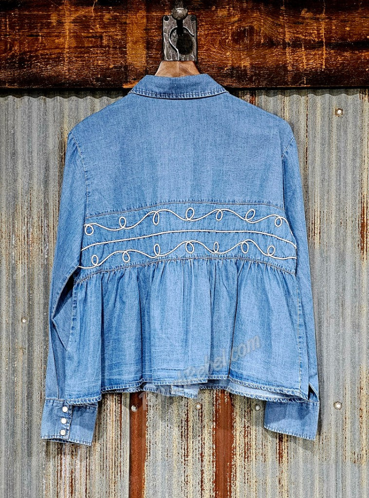 A fun top with a lot of versatility. It has a pearl snap front, three snap cuffs & a mid panel with thin rope loops sewn in place. Below that is a wide ruffle panel. This is cute over graphic tees & tanks worn as a jacket, or under vests, sweater vests, sweatshirts, sweaters & cardigans.