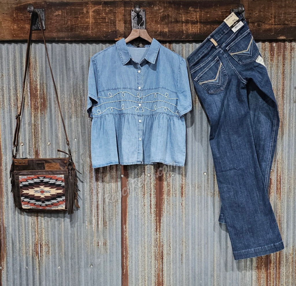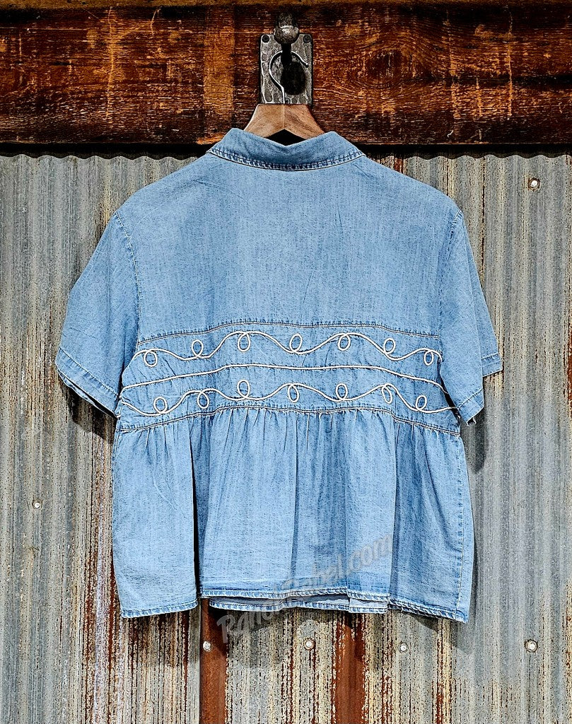 A great piece to have because its so versatile! Super soft denim with a pearl snap front, white "rope" sewn in loops around the mid section & a gently gathered bottom. This is cute on its own, open over something, or with one of our vests layered over the top!