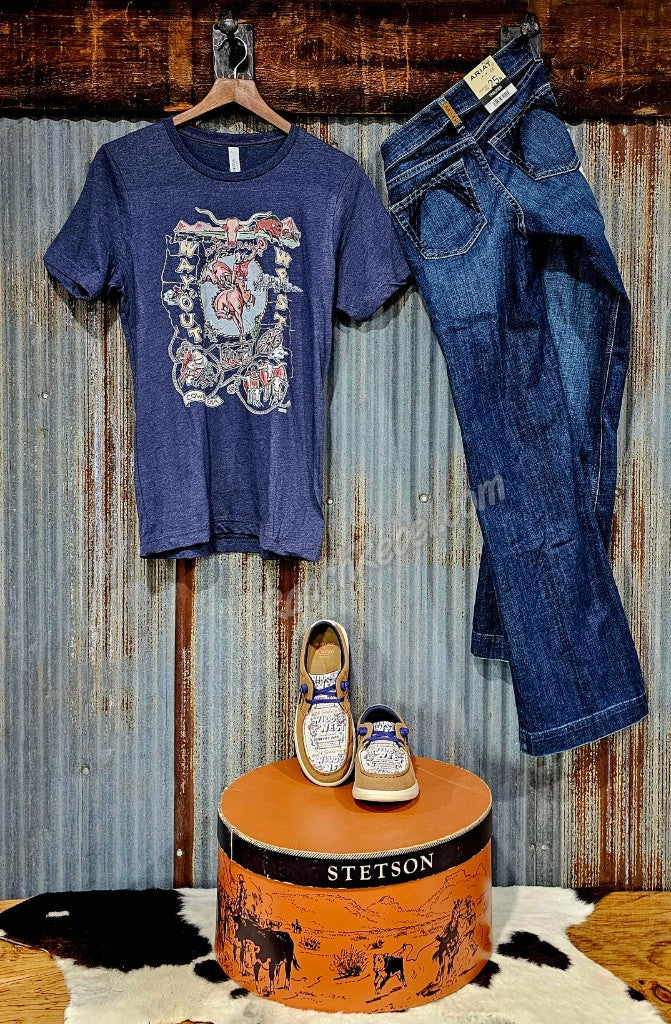 A map of the West & all the things that go with it. Cowboys, rodeo, cattle, buffalo, cowboy gear, chuckwagons & campfires. Printed on a heather navy crew neck tee.